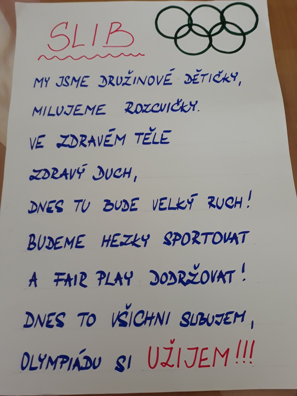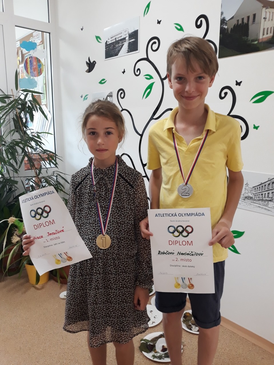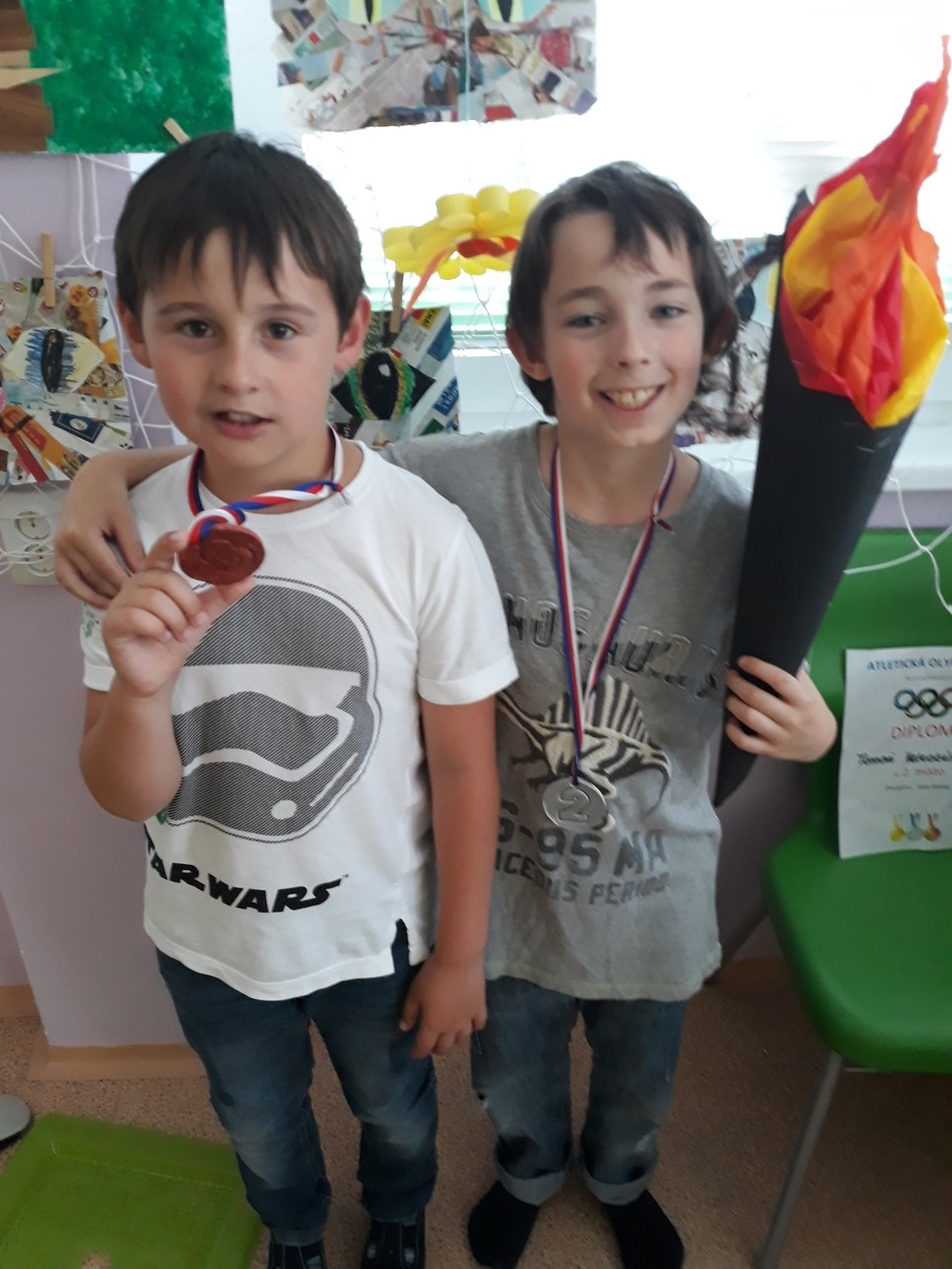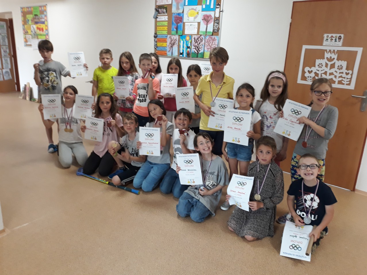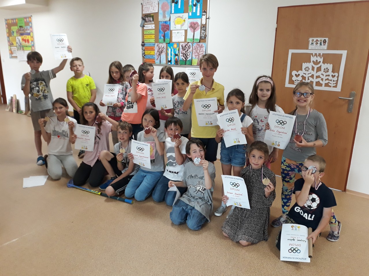 V minulém týdnu se v naší družině konala Atletická olympiáda pro všechny šikovné děti ZŠ Korytná. Počasí nám přálo. Děti nejprve složily slib, při kterém slíbily, že budou hrát FAIR-PLAY! Poté naši olympionici přenesli olympijský oheň na fotbalové hřiště. Zde se utkali ve 3 disciplínách – hod kriketovým míčkem, skok do dálky a běh na 50m. Všichni bojovali do posledních sil. Jako správní olympionici, byly i naše děti za skvělé výkony odměněny medailí, diplomem a sladkostí. Nechyběla ani pochvala, vzájemná podpora a potlesk.