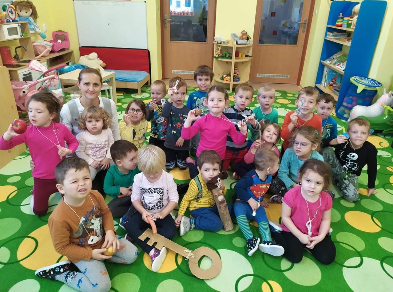 V pondělí 25.11.2019 jsme měli ve znamení loučení s podzimem. Pomocí vlastnoručně vyrobených klíčů, zaklínadla a skřítka Podzimníčka děti zamkly les. Tím jsme uzavřeli jeden z integrovaných bloků s názvem Barvy podzimu, který začal již v září. Během této doby se děti mnohé dozvěděly, naučily a vyrobily spoustu hezkých výtvorů. Zimní čas již klepe na dveře a my můžeme volně přejít do nového časového bloku, který je nazván Bílá zima.