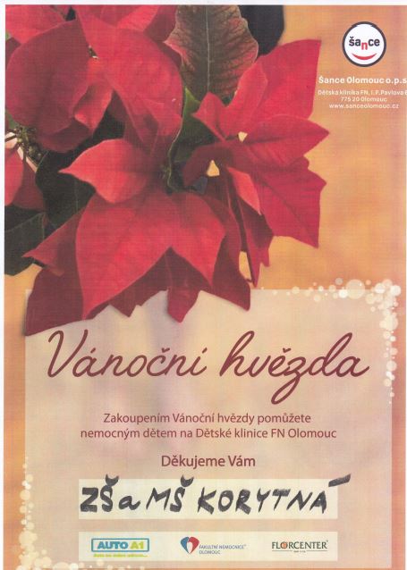 „Kupte si vánoční hvězdu a celé Vánoce Vás bude hřát pocit, že jste pomohli těžce nemocným dětem“. Již 25 let prodávají vánoční květinu rodiny léčených dětí, zdravotní personál, členové a přátelé Šance ale především dobrovolníci, aby pomohli těžce nemocným dětem, které se léčí na Dětské klinice Fakultní nemocnice v Olomouci. Letošní výtěžek, který zůstává jako předešlé peníze v regionu, bude využitý na humanizaci nemocničního prostředí, na nákup nadstandartního vybavení a zdravotnických potřeb, na finanční a sociální pomoc rodinám, na financování rekondičních pobytů pro malé pacienty po léčbě, na nákup dárků, výtvarného materiálů a na financování volnočasových aktivit. V letošním roce od 21. 11. 2022 se můžete setkat s prodejci vánočních hvězd pro nemocné děti na různých místech České republiky – třeba v naší školičce.