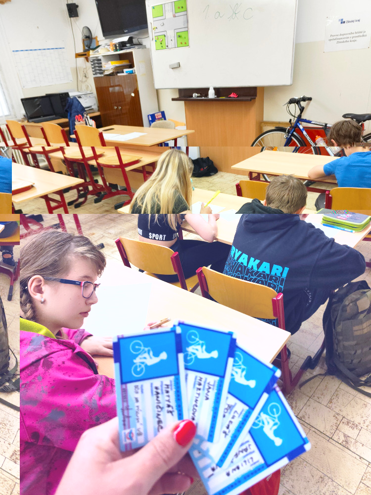 Žáci 4. ročníku byli v tomto školním roce už podruhé pozvaní do Uherského Brodu na Dopravní hřiště. Při podzimní návštěvě si vyzkoušeli, co všechno je může jako účastníky silničního provozu potkat. Teď při jarní návštěvě už bylo třeba své znalosti a dovednosti ukázat nejen v teoretické části – v testu, ale i prakticky – při jízdě na kole. Máme šikovné školáky, všichni obě části zvládli na výbornou a průkaz cyklisty si zasloužili. Tak hlavně na silnici bezpečně!