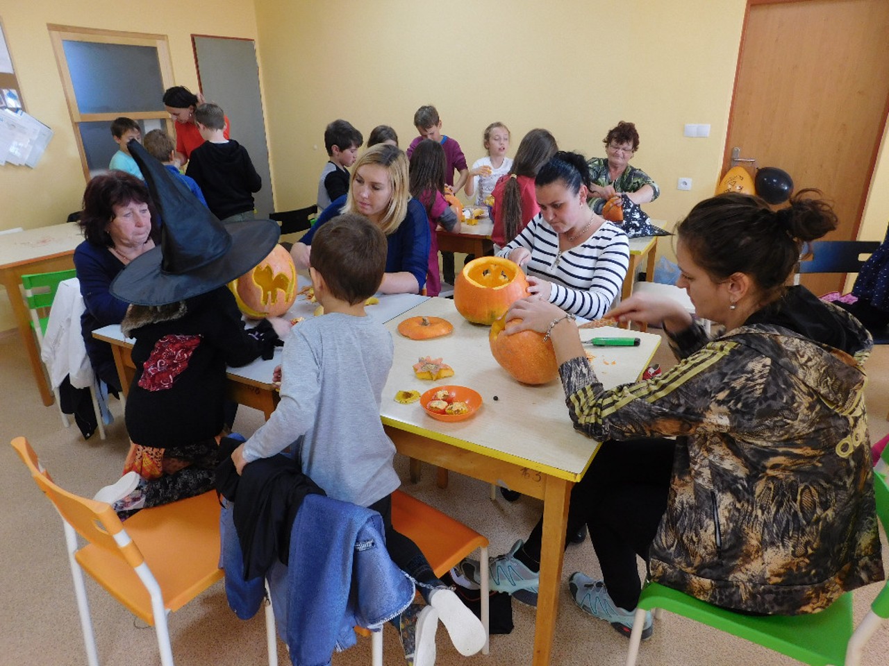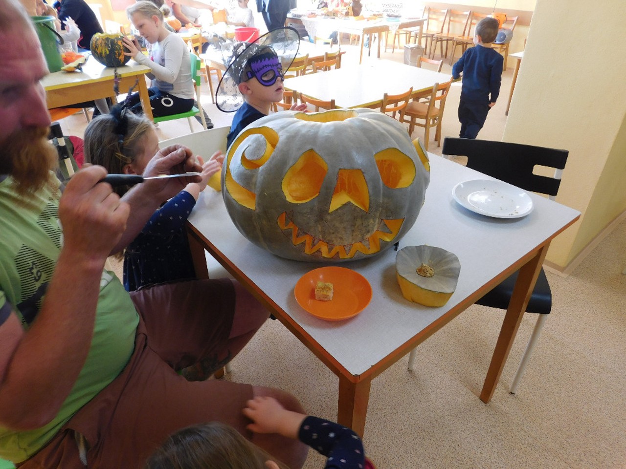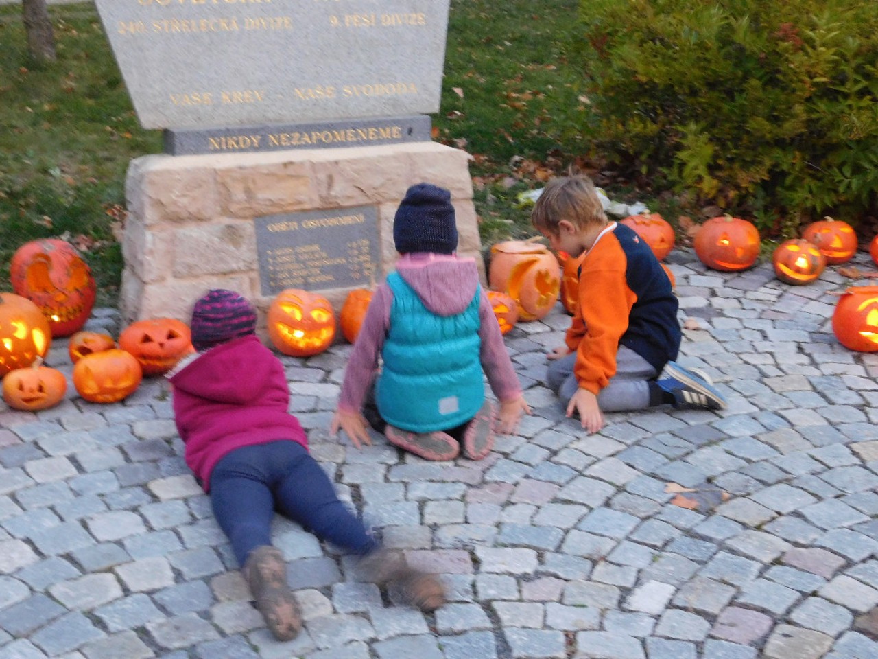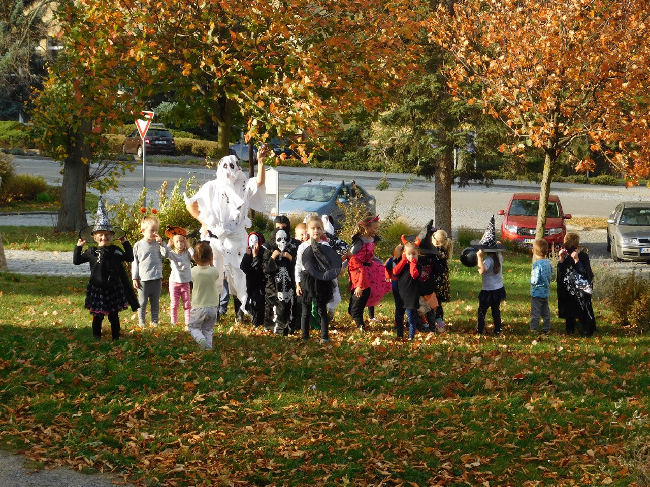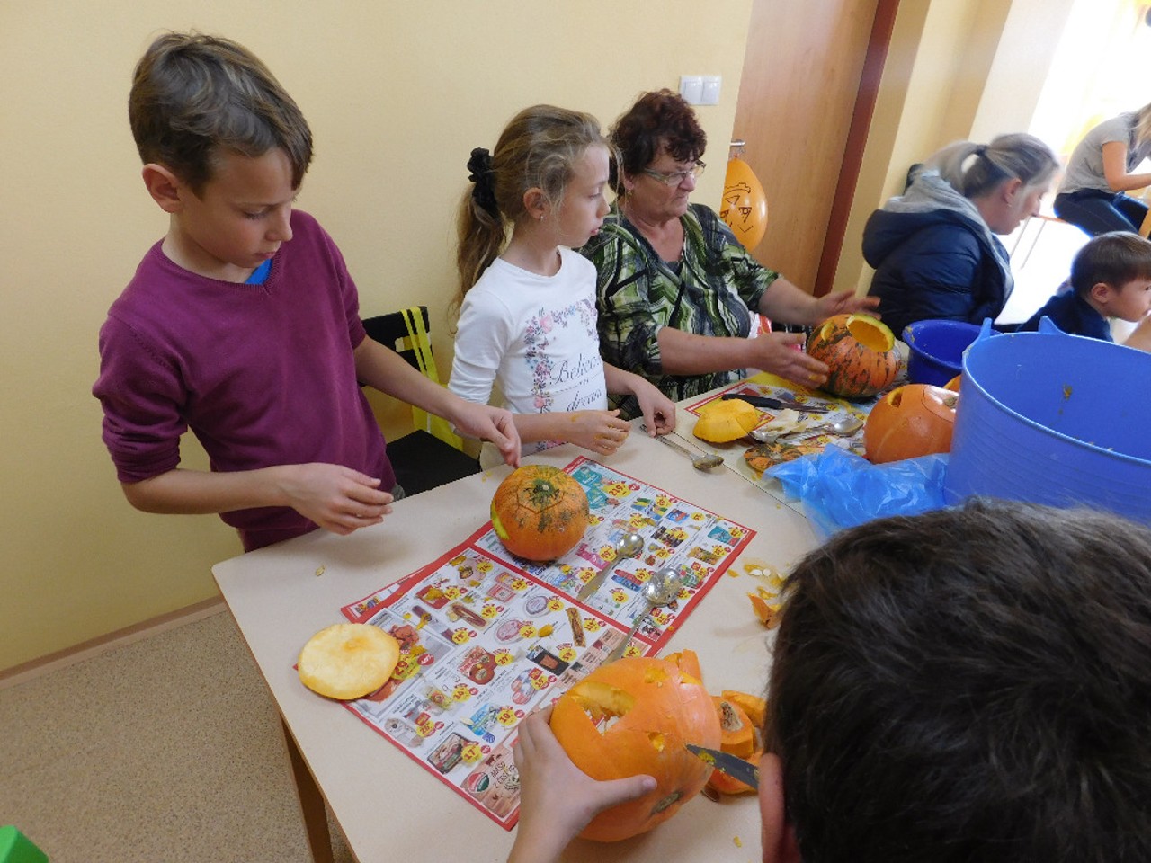 V ranním oparu ke školce přicházely roztodivné postavy čarodějnic, upírů a strašidel, které pak v budově zahájily své nekalé reje. Jejich „řádění“ neušly ani děti ZŠ a na své si přišli i zaměstnanci OÚ včele s panem starostou. Po nezbytném občerstvení a odpočinku se k nim přidali i někteří rodiče a děti ze ŠD. Ve školní jídelně vznikaly krásné dlabané dýně, které si navečer přišli rodiče i děti rozsvítit k památníku padlých. Děkujeme všem, kteří na akci přinesli výborné občerstvení z dýní.