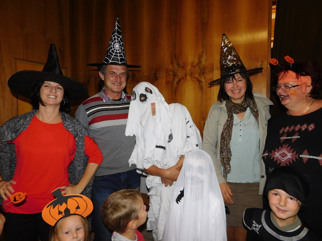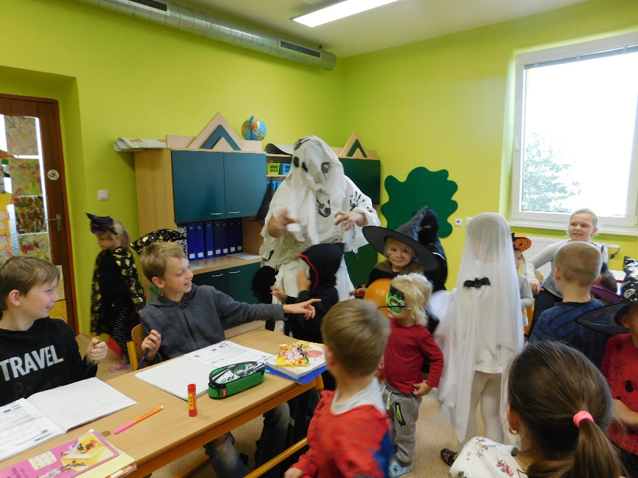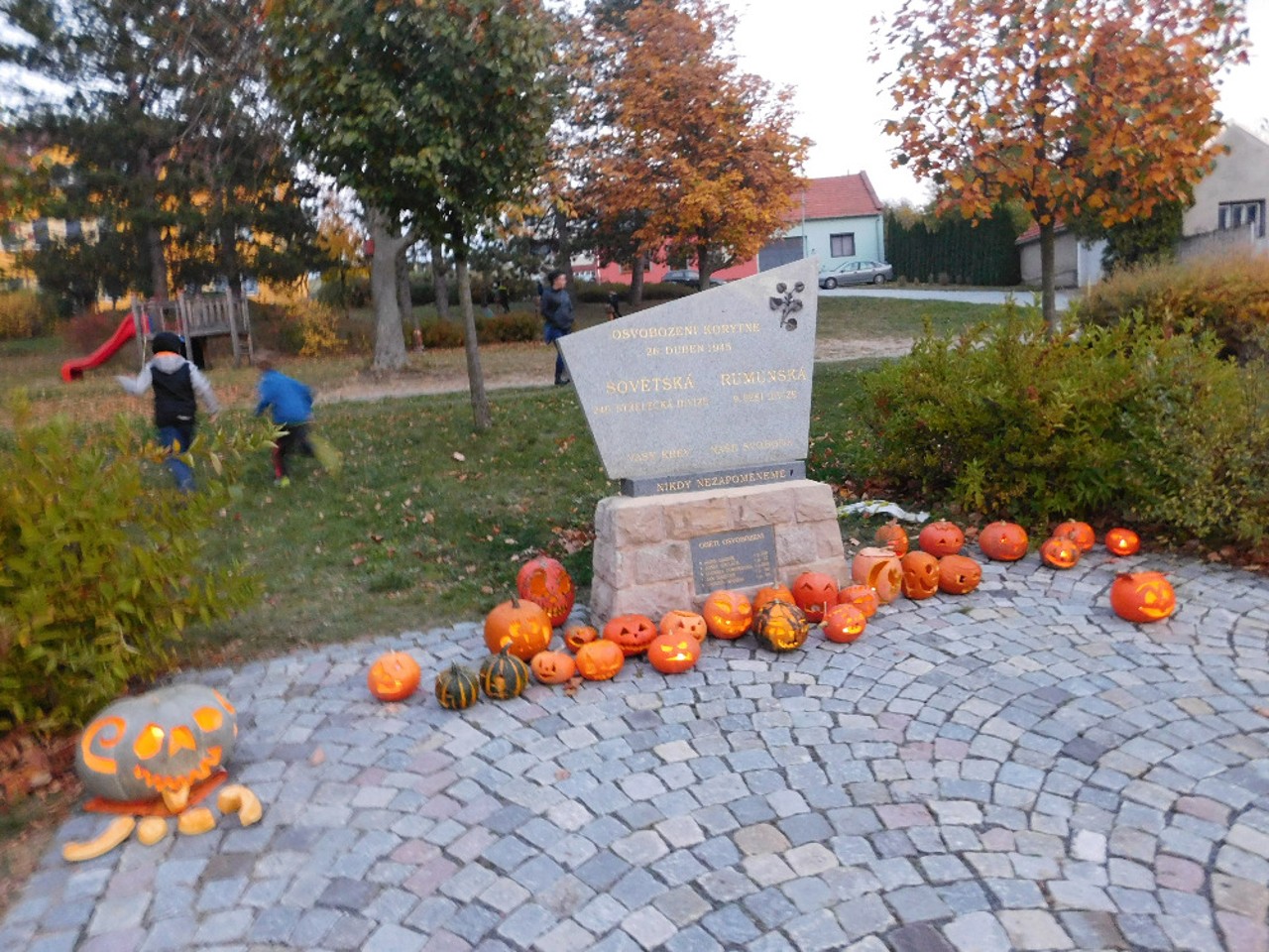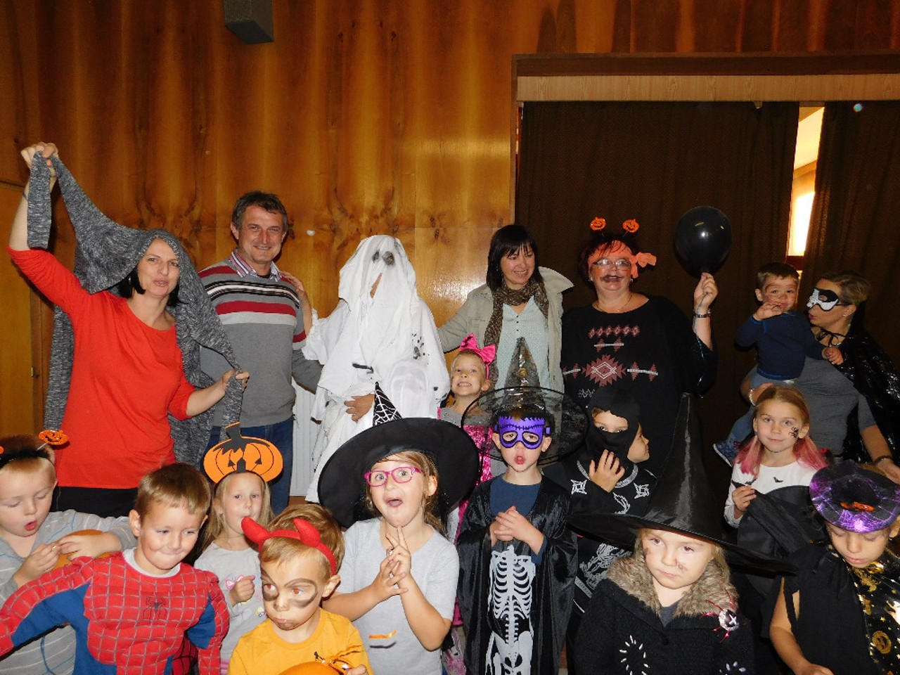 V ranním oparu ke školce přicházely roztodivné postavy čarodějnic, upírů a strašidel, které pak v budově zahájily své nekalé reje. Jejich „řádění“ neušly ani děti ZŠ a na své si přišli i zaměstnanci OÚ včele s panem starostou. Po nezbytném občerstvení a odpočinku se k nim přidali i někteří rodiče a děti ze ŠD. Ve školní jídelně vznikaly krásné dlabané dýně, které si navečer přišli rodiče i děti rozsvítit k památníku padlých. Děkujeme všem, kteří na akci přinesli výborné občerstvení z dýní.