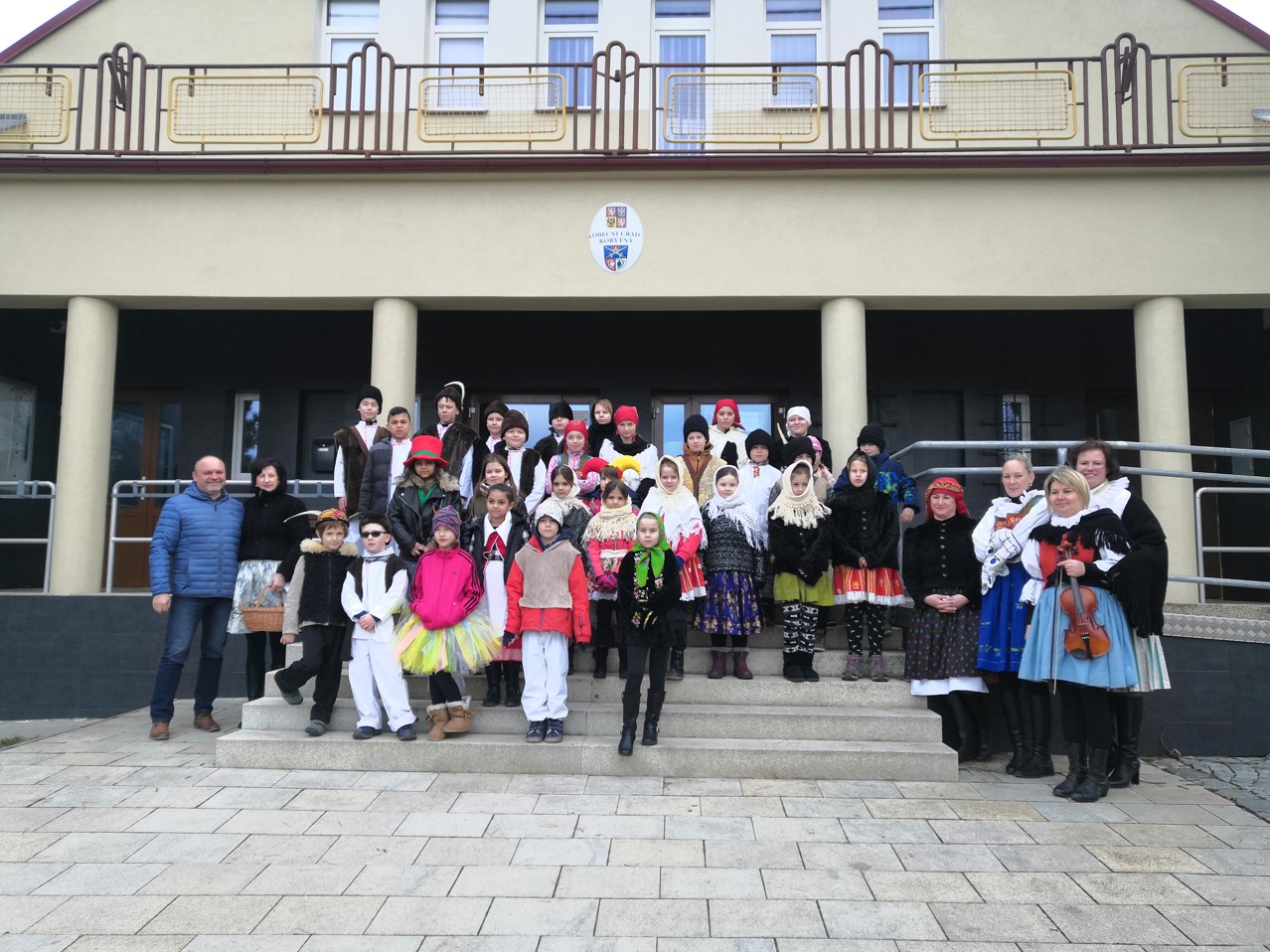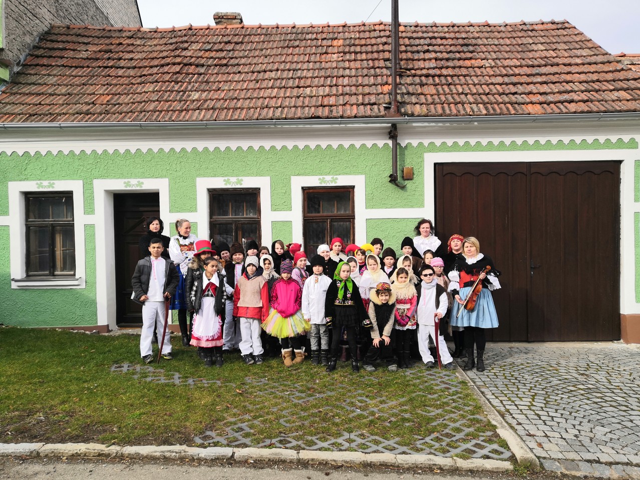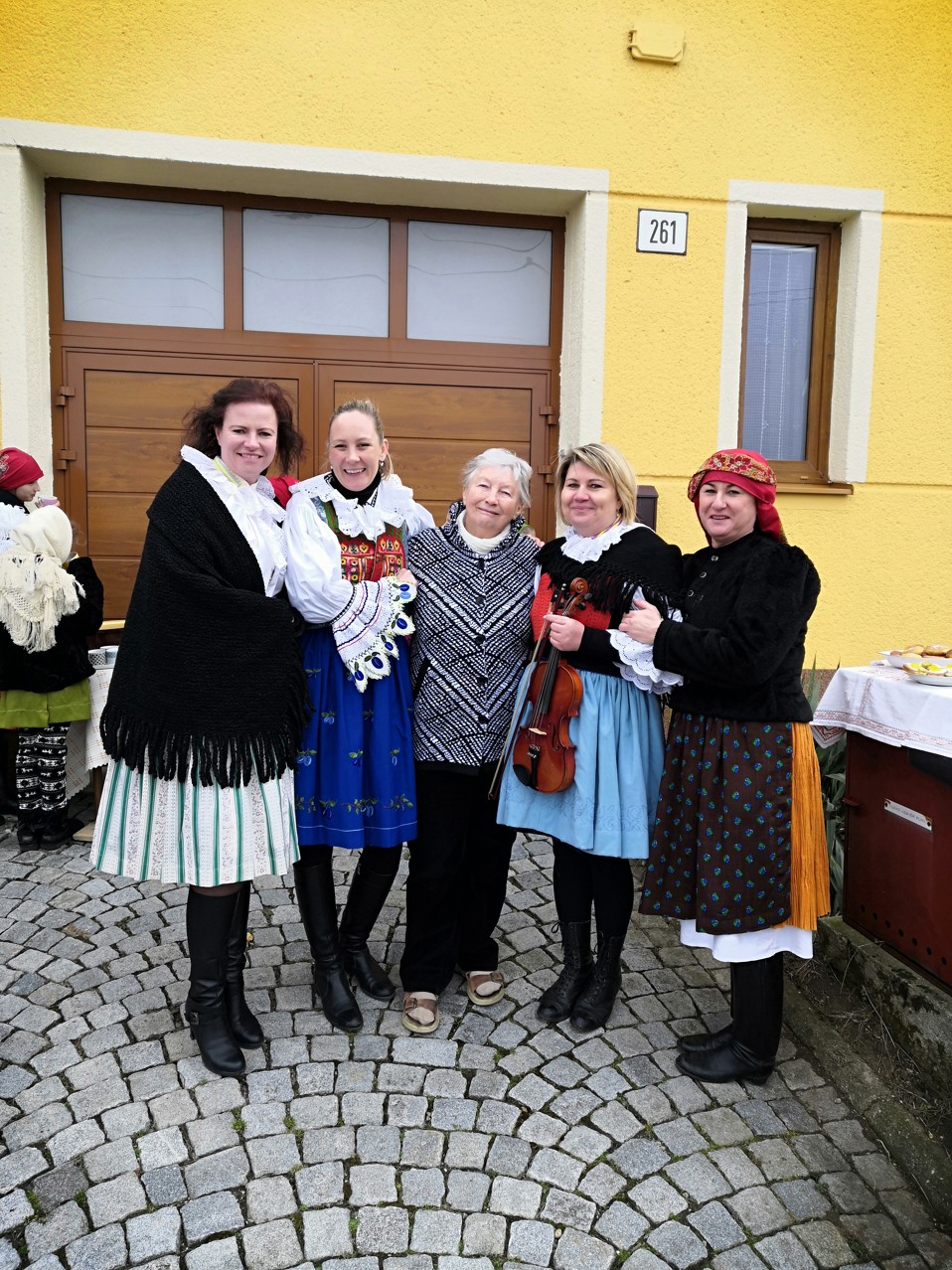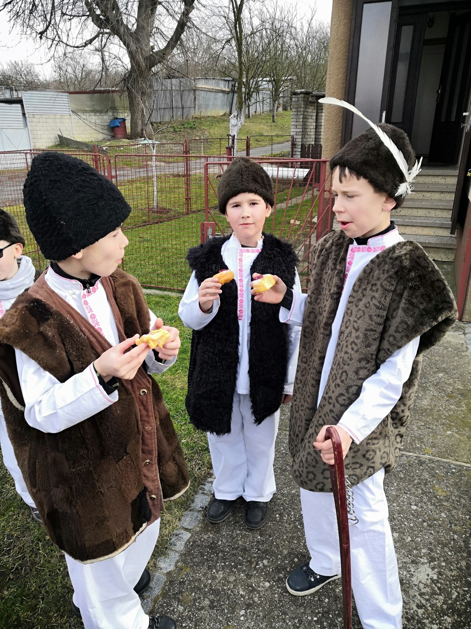 Dnešní krásné úterní fašankové dopoledne jsme zahájili podšablovým tancem a zpěvem před obecním úřadem. Naše kroky vedly dále do dědiny. Tam jsme rozveselili nejen obyvatele pečovatelského domu, ale i všechny Korytňany, kteří byli tou dobou doma. Se všemi jsme se poveselili a ochutnali jsme spoustu jejich masopustních dobrot. Koblihy, boží milosti, škvarky, slanina, chlebíčky a vdolečky naplnily břúška našich malých fašančárů. Počasí nám taky přálo a obchůzku jsme si krásně užili.