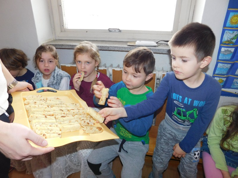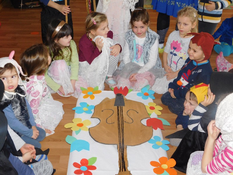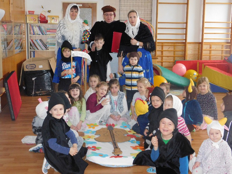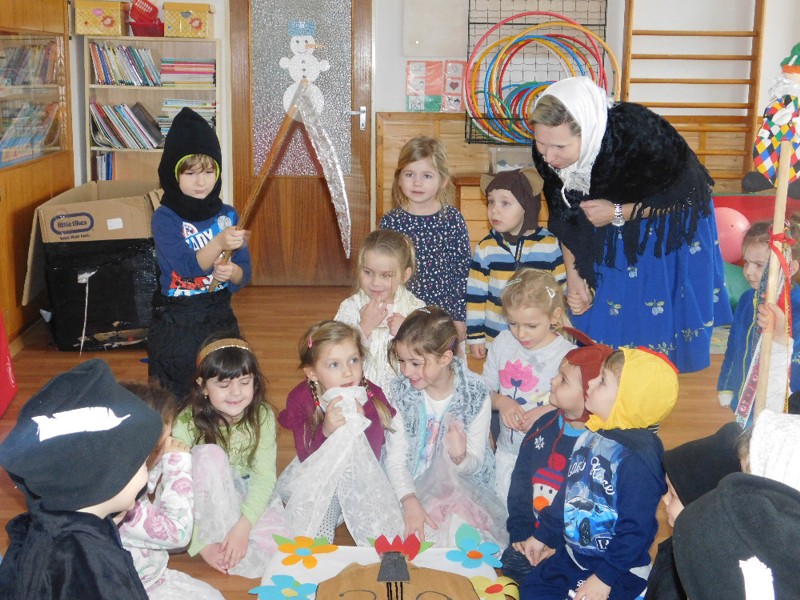 Také naši školáci a děti z mateřské školy se připojili, stejně jako každý rok, k tradičnímu masopustnímu průvodu. Obchůzku jsme zahájili před obecním úřadem. Děti zazpívaly a zatancovaly připravené pásmo. Poté jsme se společně vydali obejít dědinu. Počasí nám moc nepřálo, celé dopoledne nás doprovázelo sněžení. Při obchůzce jsme dostali nasmažené koblihy, boží milosti, klobásky, slaninu a mnoho dalších dobrot. Takže když jsme přišli do školní jídelny na oběd, byli už prakticky všichni plní masopustních dobrot. Pěkné dopoledne plné tance a zpěvu jsme si všichni užili.