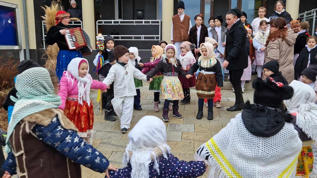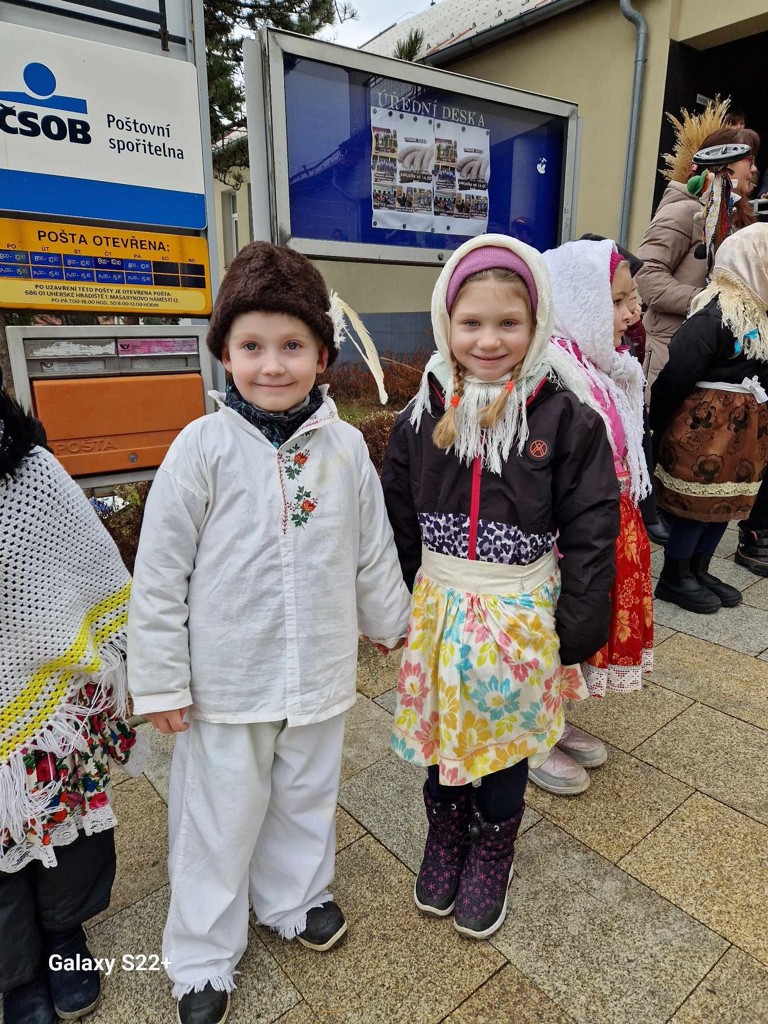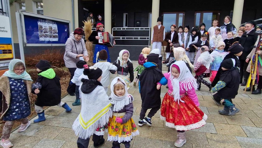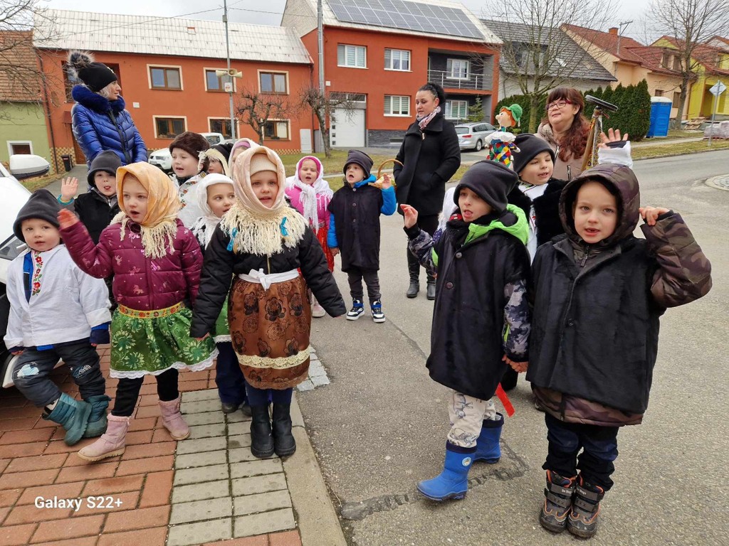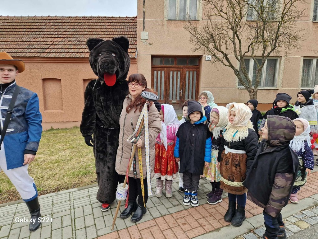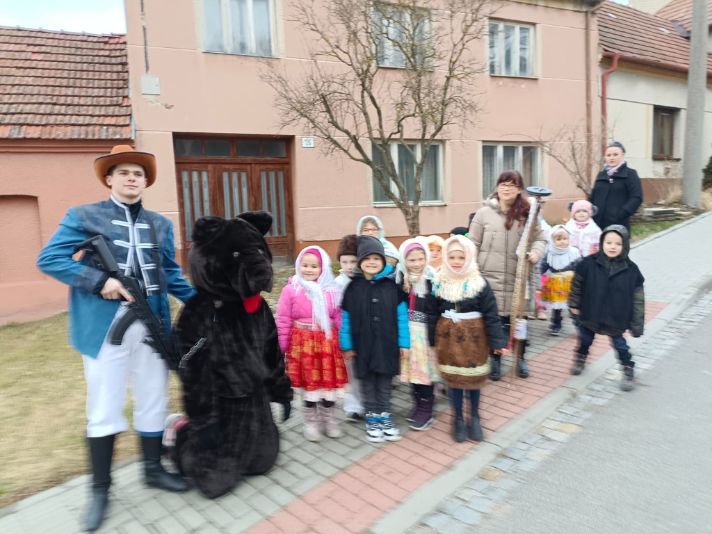 Három, fárom, pod kočárom.... a jiné fašankové písničky zazpívali naši nejmenší. Obchůzku jsme zahájili krátkým vystoupením  před obecním úřadem. Ozembuchy, kroje, harmonika, pohoštění, navodily tu správnou fašankovou náladu. Dětem se líbily hlavně maškary a nejvíc medvěd.
