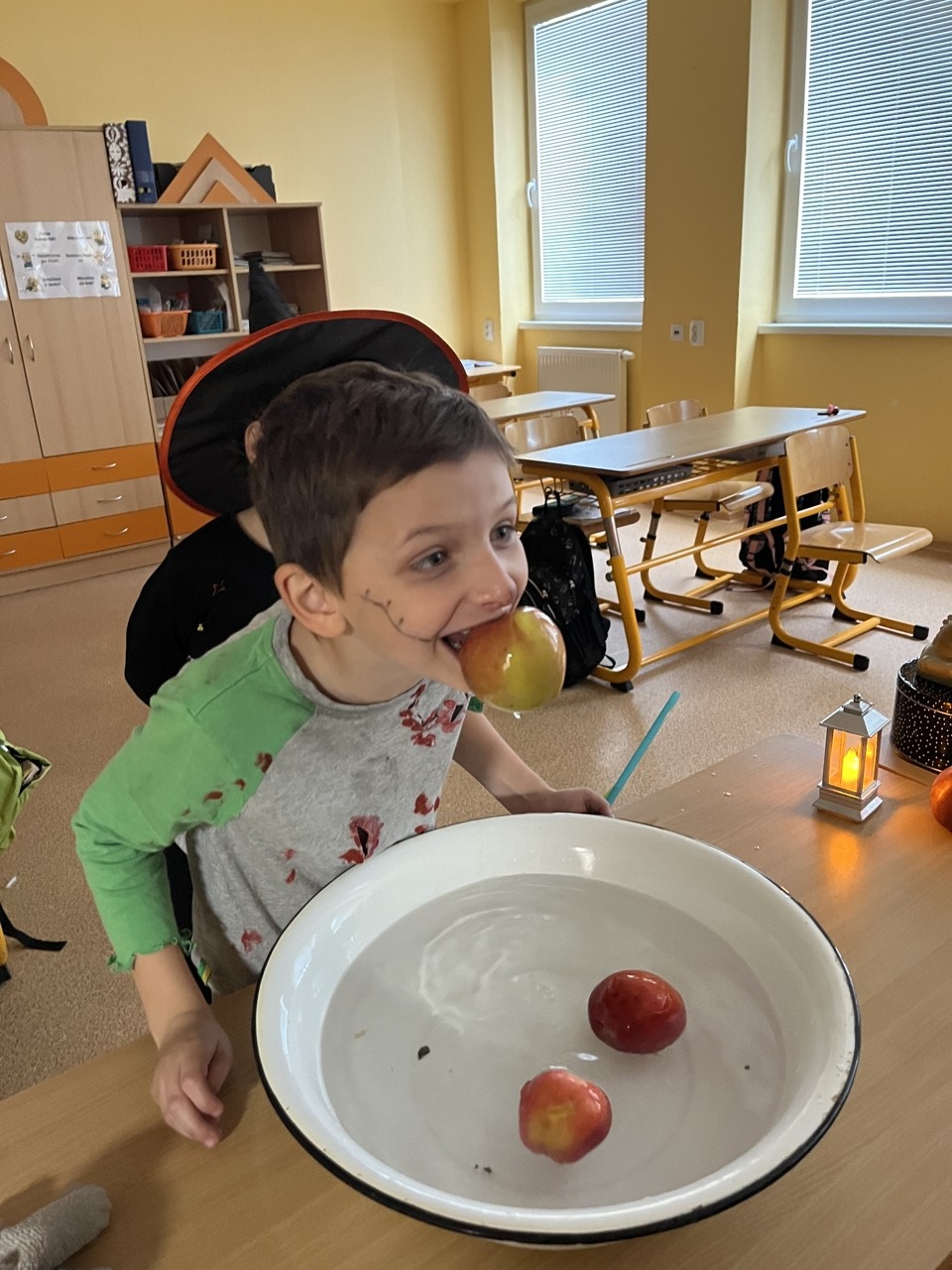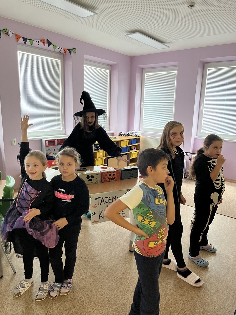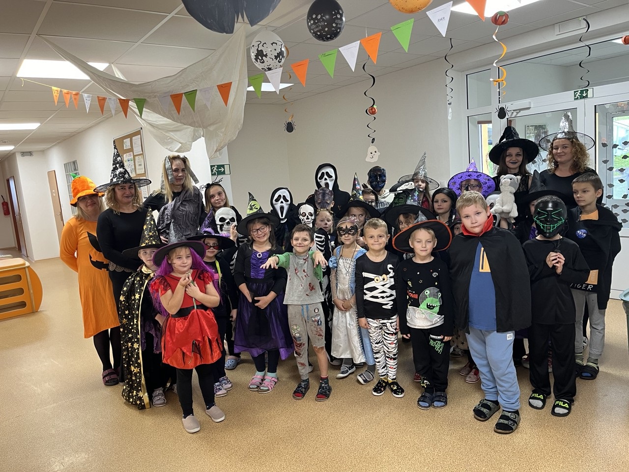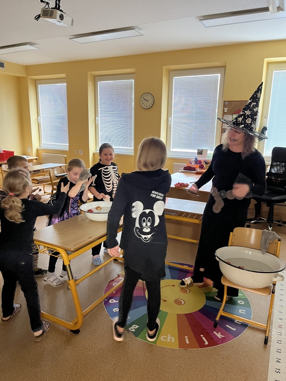 Dnešní den patřil v naší škole Halloweenu. Každá čarodějnice, smrtka, kostra, strašidlo, vřískot aj. si mohli užít zaslouženou zábavu v různých strašidelných doupatech. Celý program byl v režii paní učitelek, které se také patřičně zamaskovaly. Na pěti zastávkách plnili žáci úkoly jako je třeba lovení jablek v míse s vodou, hledání pavouků v dýni, halloweenské pexeso nebo posunování pavoka bludištěm. Za každý splněný úkol dostali sladkou odměnu. Do přípravy Halloweenu se zapojily i některé maminky, ty připravily dětem vskutku strašidelné pochoutky. Děkujeme jim za pomoc. Po splnění všech úkolů dostali úplně všichni za odměnu halloweenské žvýkačkové lízátko.