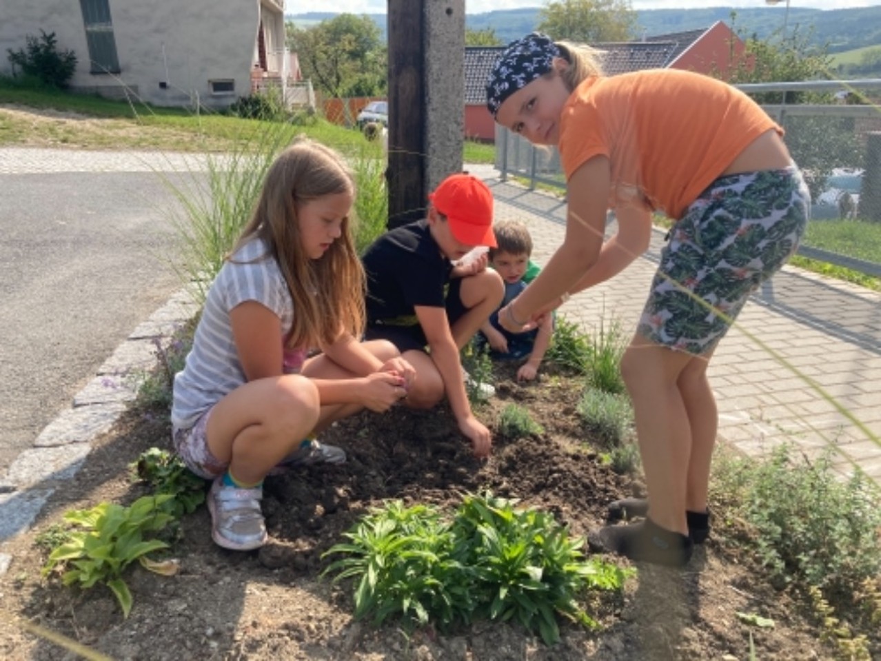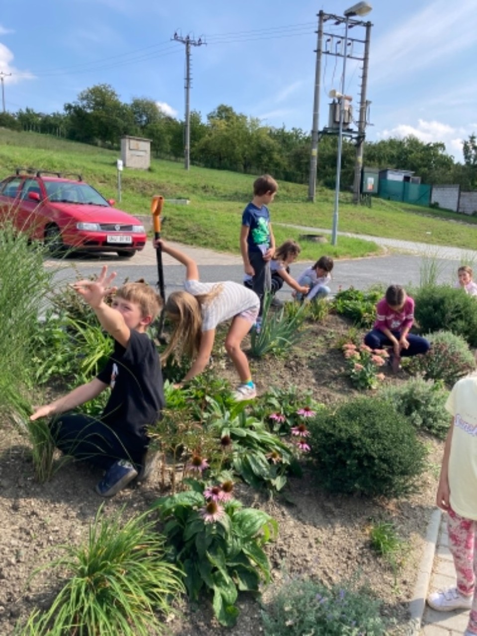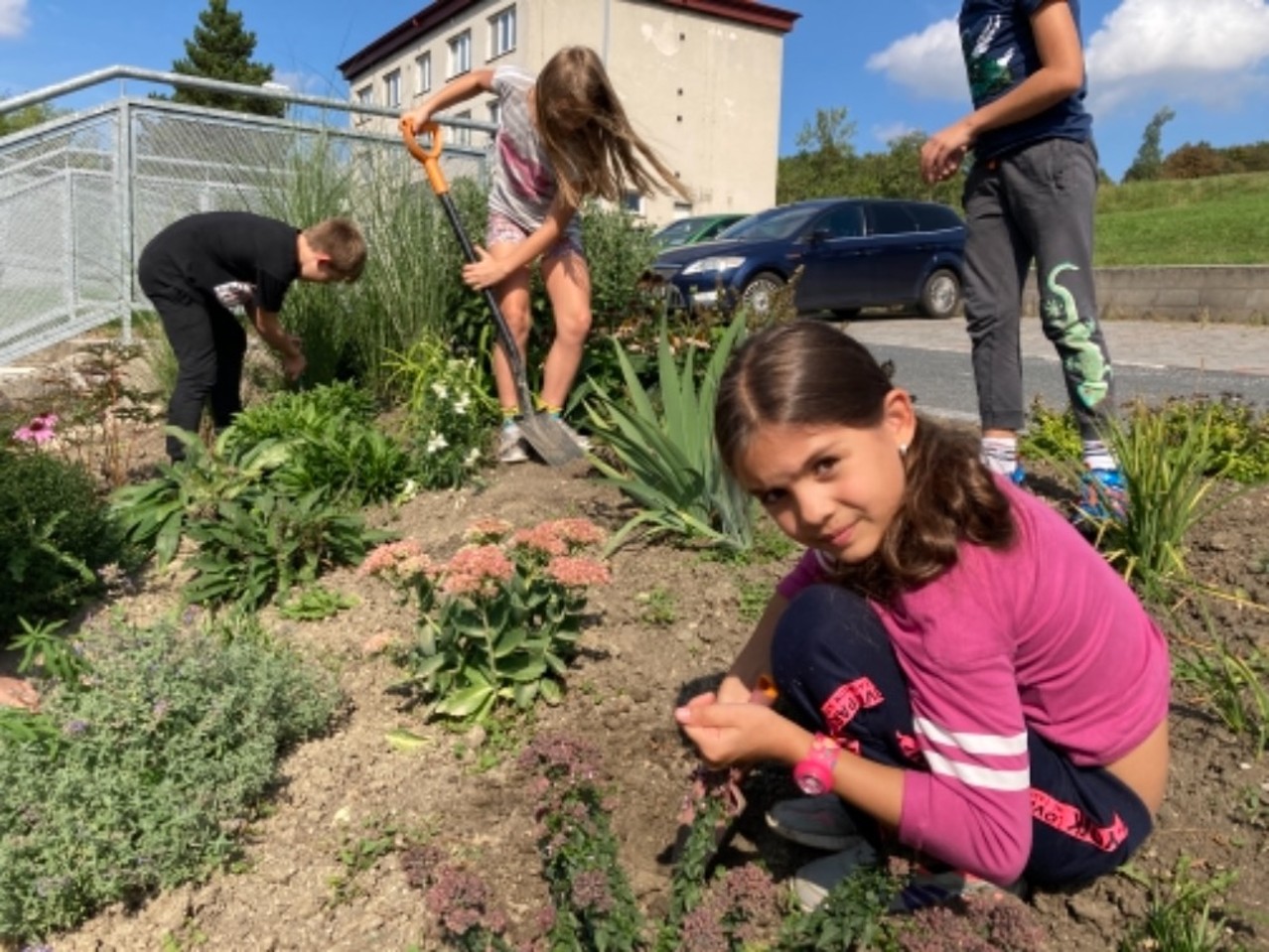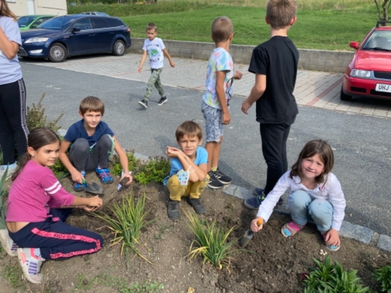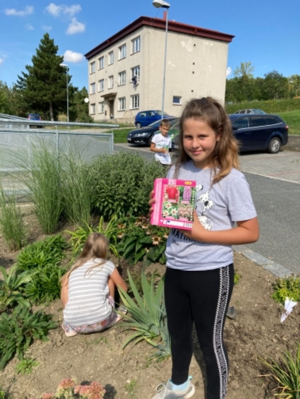 Náš školní záhon nám dělá radost. Většina rostlinek vysazených na jaře se dobře ujala. Děti v družině poctivě hnojily a zalévaly, takže některé trvalky i poprvé rozkvetly. Po prázdninách jej naše paní školnice Květa vysvobodila od plevele, aby naše prvňáčky přivítal v celé své podzimní kráse. Rozkvetly nám rozchodníky, šalvěje, astřičky a kohoutky. Zastihli jsme i pár květů letní lilie. Celkově všechny trvalky pěkně zesílily, stejně jako okrasné traviny, které vykvetou v příští sezoně. A poslední úkol té letošní sezóny, který naši ekoškolu čekal, bylo osázení záhonu jarními cibulovinami. Děti v družině připravily půdu pokypřením a vypletím. Pak už každý vyhloubil svou jamku hlubokou tak, jak si přečetl na obalu svých cibulek. A mohlo se sázet!