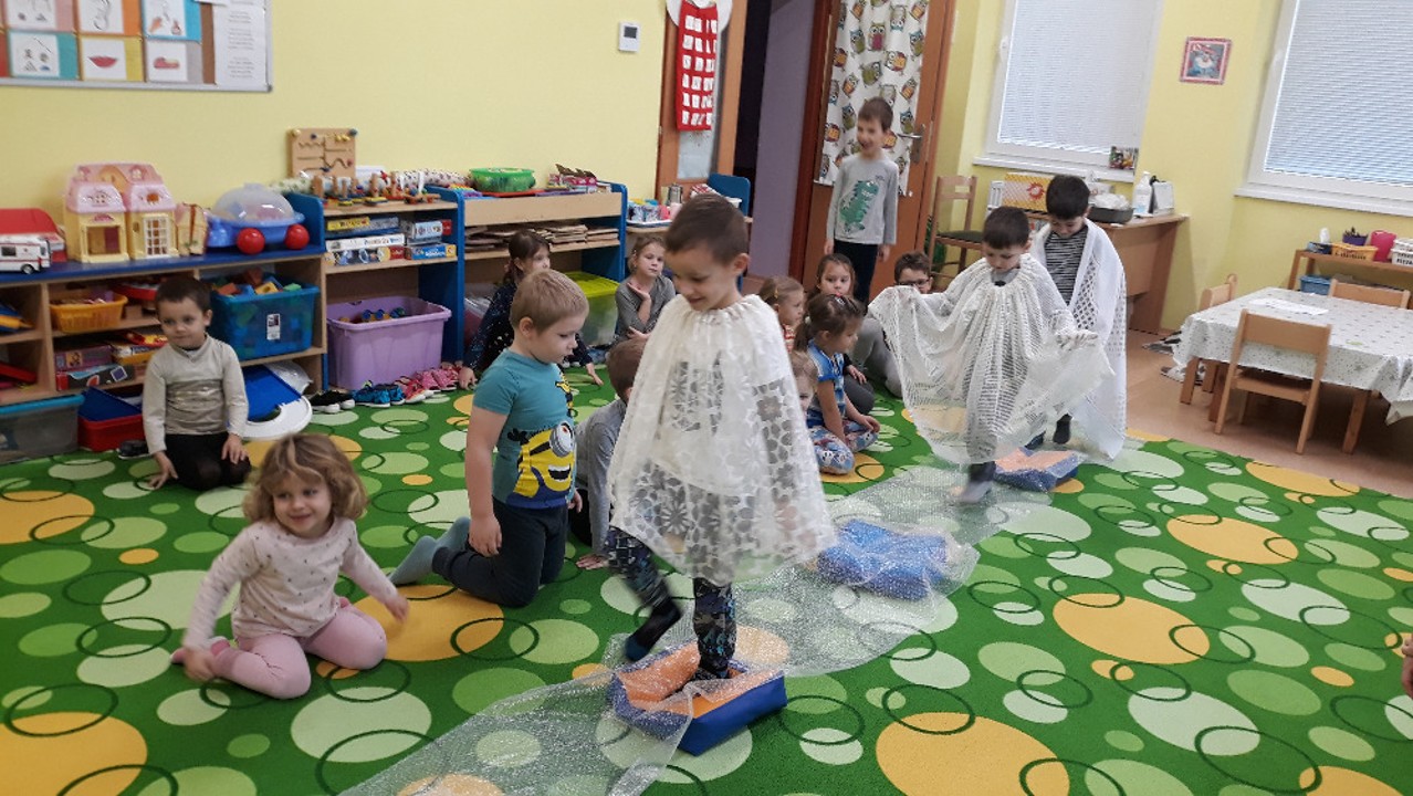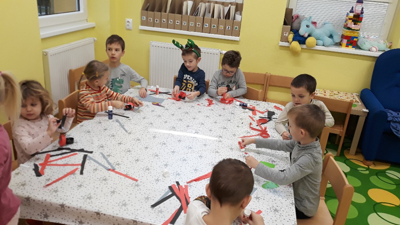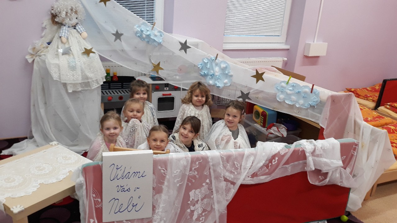 Na příchod Mikulášské družiny jsme se ve školce připravovali už týden předem. Ve třídě Motýlku vyrostlo „Peklíčko“ i „Nebíčko“. Děti si oba světy hezky vyzdobily a každý si mohl vybrat, kde si bude hrát, kde se cítí nejlépe. Společně jsme si pak hráli na andílky, kteří stoupají do nebe po nebeské cestě, bloudili jsme v andělské mlze a také jsme si uspořádali módní andělskou přehlídku spojenou s božskými tanečky. Čertům jsme vařili čertovský guláš, který každý dochutil svou tajnou přísadou. Protože se v našem „Peklíčku“ nebáli ani ti nejmenší, mohli jsme v pondělí 6. 12. přivítat vzácnou nebeskou i pekelnou návštěvu.