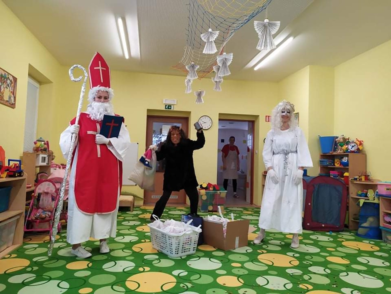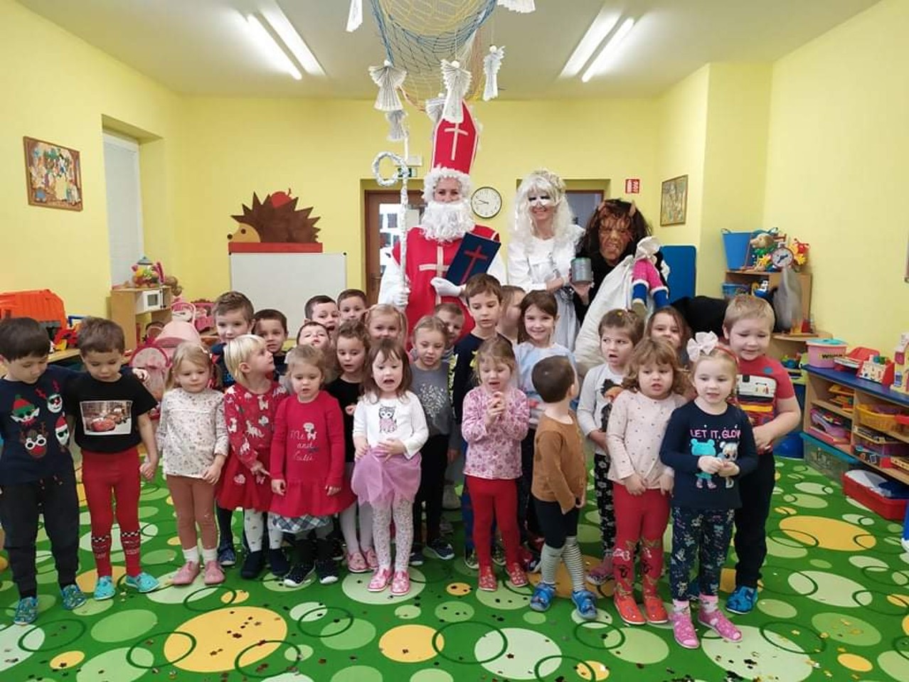 Na příchod Mikulášské družiny jsme se ve školce připravovali už týden předem. Ve třídě Motýlku vyrostlo „Peklíčko“ i „Nebíčko“. Děti si oba světy hezky vyzdobily a každý si mohl vybrat, kde si bude hrát, kde se cítí nejlépe. Společně jsme si pak hráli na andílky, kteří stoupají do nebe po nebeské cestě, bloudili jsme v andělské mlze a také jsme si uspořádali módní andělskou přehlídku spojenou s božskými tanečky. Čertům jsme vařili čertovský guláš, který každý dochutil svou tajnou přísadou. Protože se v našem „Peklíčku“ nebáli ani ti nejmenší, mohli jsme v pondělí 6. 12. přivítat vzácnou nebeskou i pekelnou návštěvu.