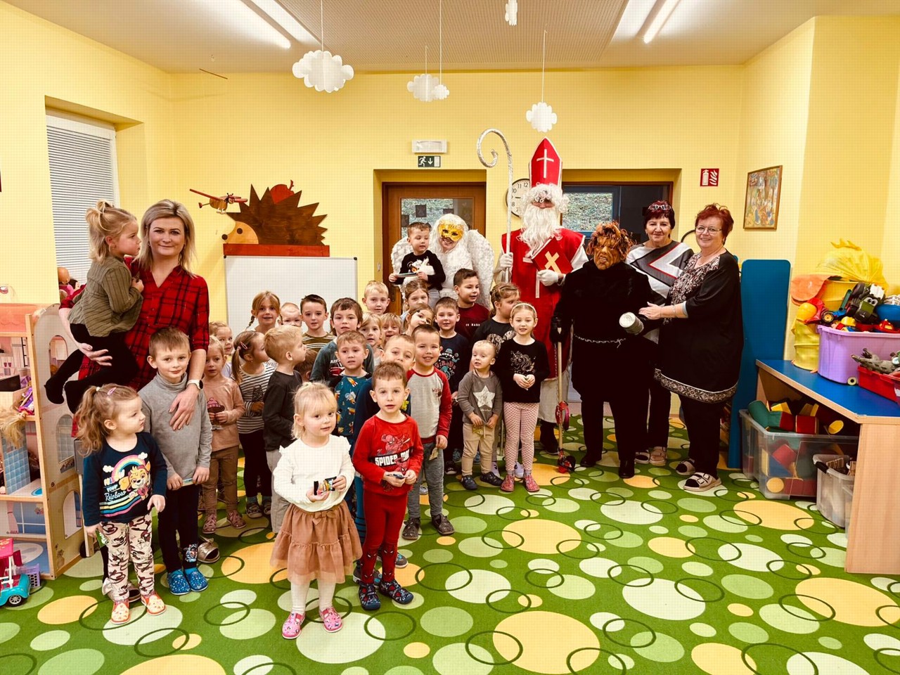 Dlouho očekávaná návštěva dorazila i do školky. Řinčení řetězů zmrazilo úsměv i těm nejodvážnějším. Jakmile začal Mikuláš listovat v Knize hříchů, nastalo hrobové ticho. Hříšníci slibovali, že se polepší a tak čert odešel s prázdným pytlem. Děti přednesly říkanky, zazpívaly a Mikuláš je obdaroval.