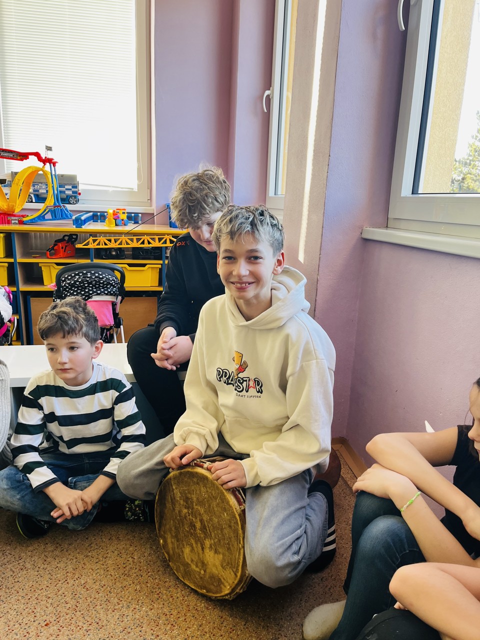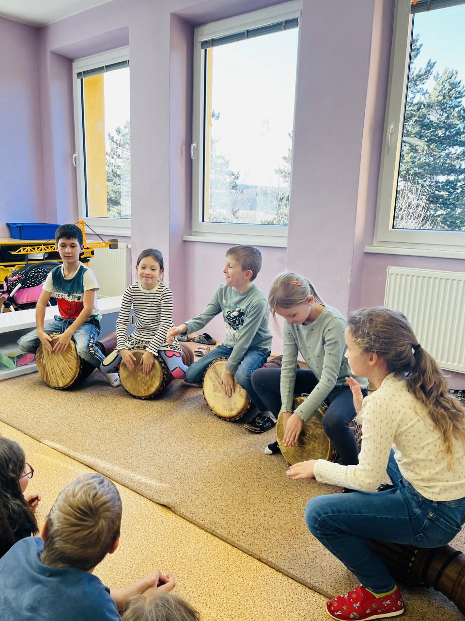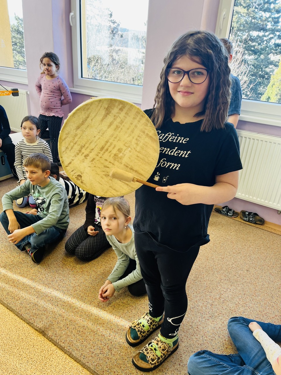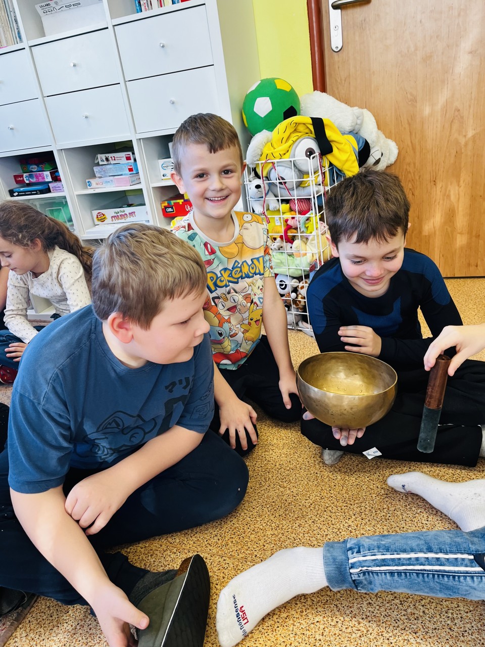 Dnes se mohli školáci seznámit s tím, jak funguje muzikoterapie. Tato technika pracuje se zvukem, rytmem, melodií a harmonií. Využívají se různé nástroje, často i ty, na které není nutné umět hrát, aby je mohl použít každý. Cílem této techniky je uvolnění, snížení stresu, zlepšení nálady, podpora paměti, ale i zlepšení mezilidských vztahů, podpora komunikace. Dnešní hodinka muzikoterapie zaujala všechny – malé, větší i ty nejstarší školáky.