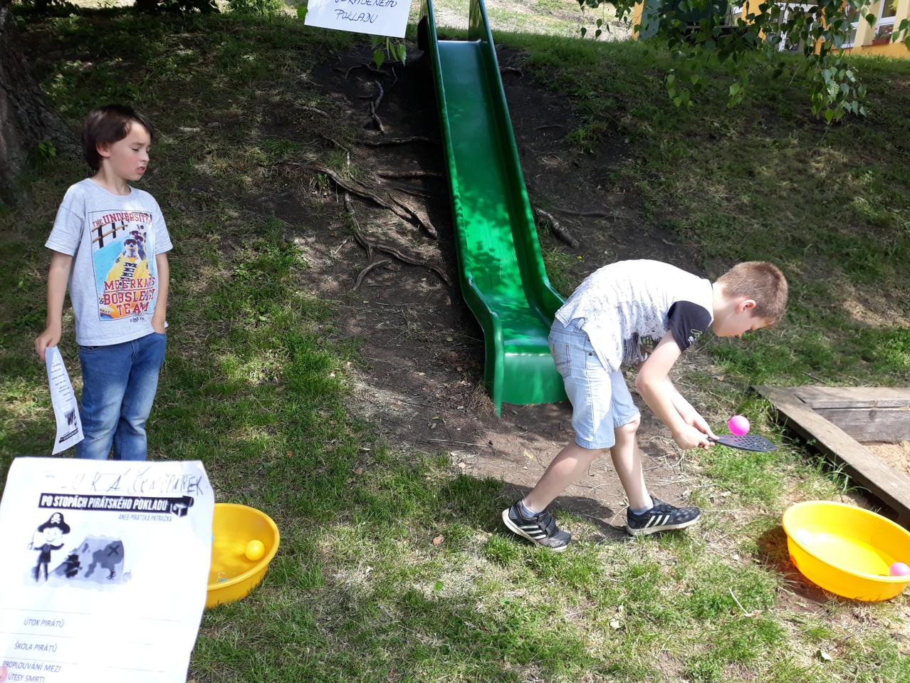 Děti v ŠD se v tomto krásném předprázdninovém týdnu vydaly po stopách pirátského pokladu. Nejprve proplouvaly mezi útesy smrti, poté prošly pirátskou školou a vyplnily pirátskou tajenku. Tím odhalily jméno pirátské lodi „POMSTA" a mohly na ni zaútočit. Velmi tiše a opatrně přenesly děti ukradený poklad. Následovalo zběsilé prchání a počítání pokladu. Děti si na závěr odnesly sladkou odměnu a radost z nalezeného pokladu.