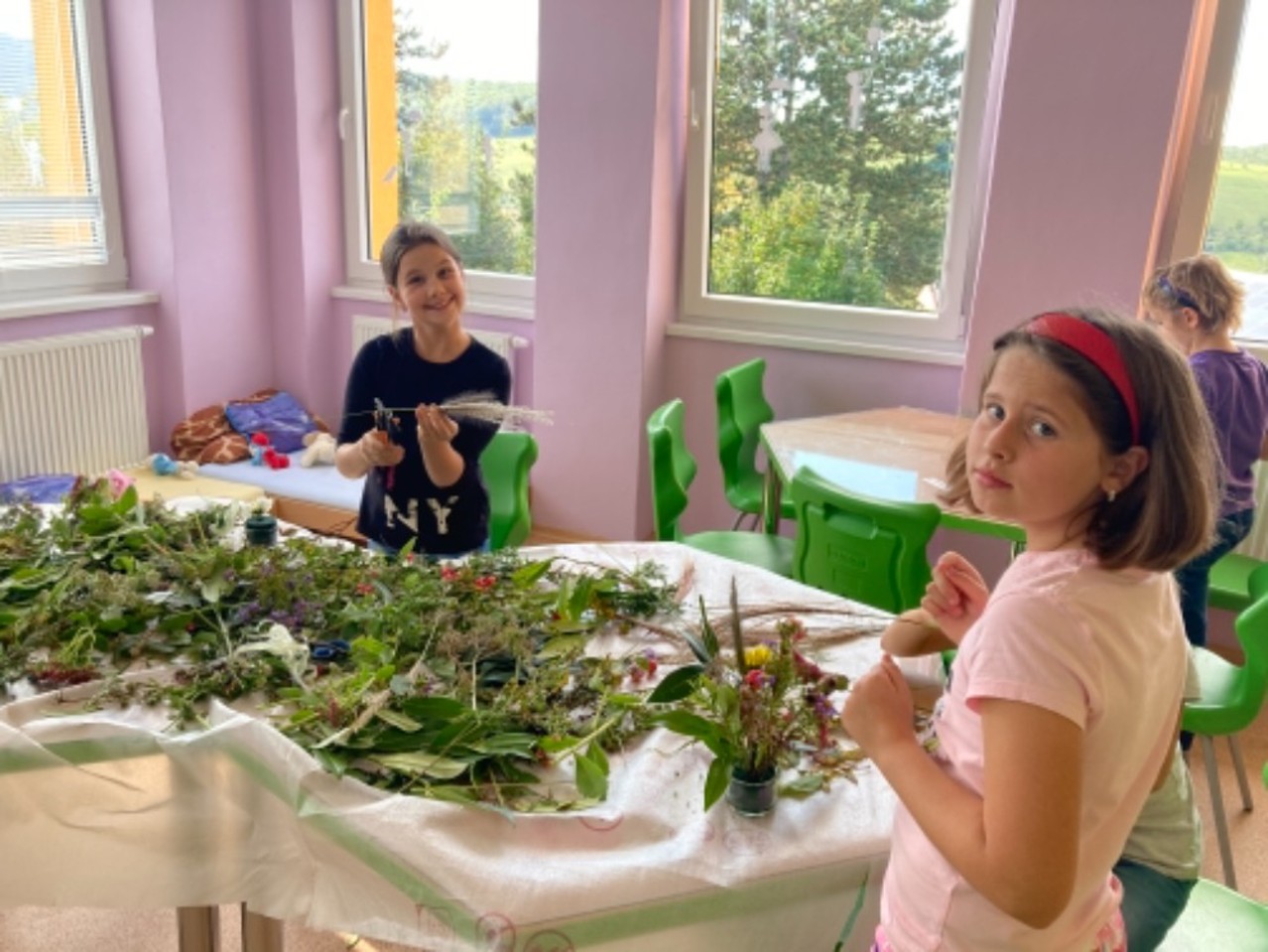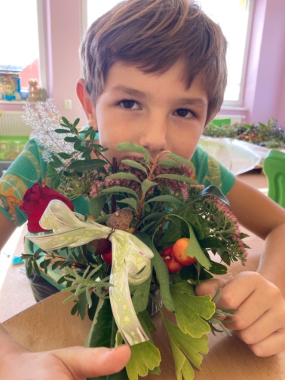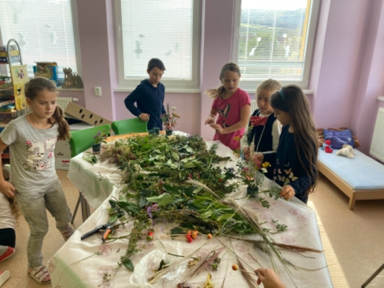 I když nám podzimní družinové tvoření zkrátil nouzový stav, tak jsme nezaháleli. Hodně času jsme trávili venku na zahradě, hřišti, ale i při výpravách k potoku či na louku. Největší úspěch mělo odpoledne s trasou podle fáborků a hledáním lístečků s úkoly. Zasadili jsme bylinky jako pomoc EKOŠKOLCE. Vyrobili jsme podzimní věnec, sovičky, záložky, leporelo o koloběhu růstu fazolky (které jsme věnovali školce) atd. Během květinového dne jsme si naaranžovali nádherné vypichované dekorace. Taky nesmíme zapomenout na tematický týden “čaj”, kdy jsme si každý den uvařili jiný druh čaje (máta, ginko, černý,…) a vyrobili jsme čajový 3D obrázek.