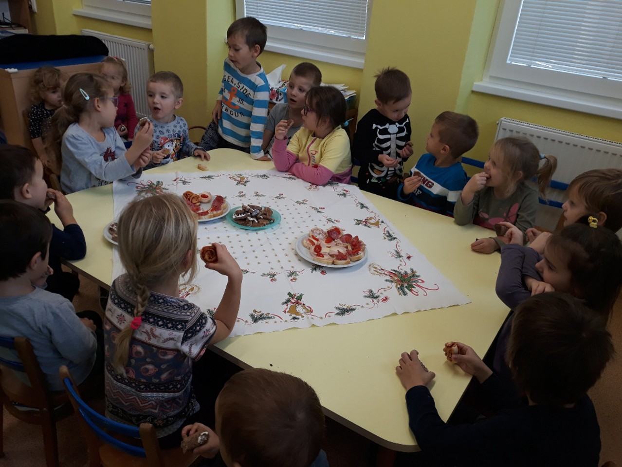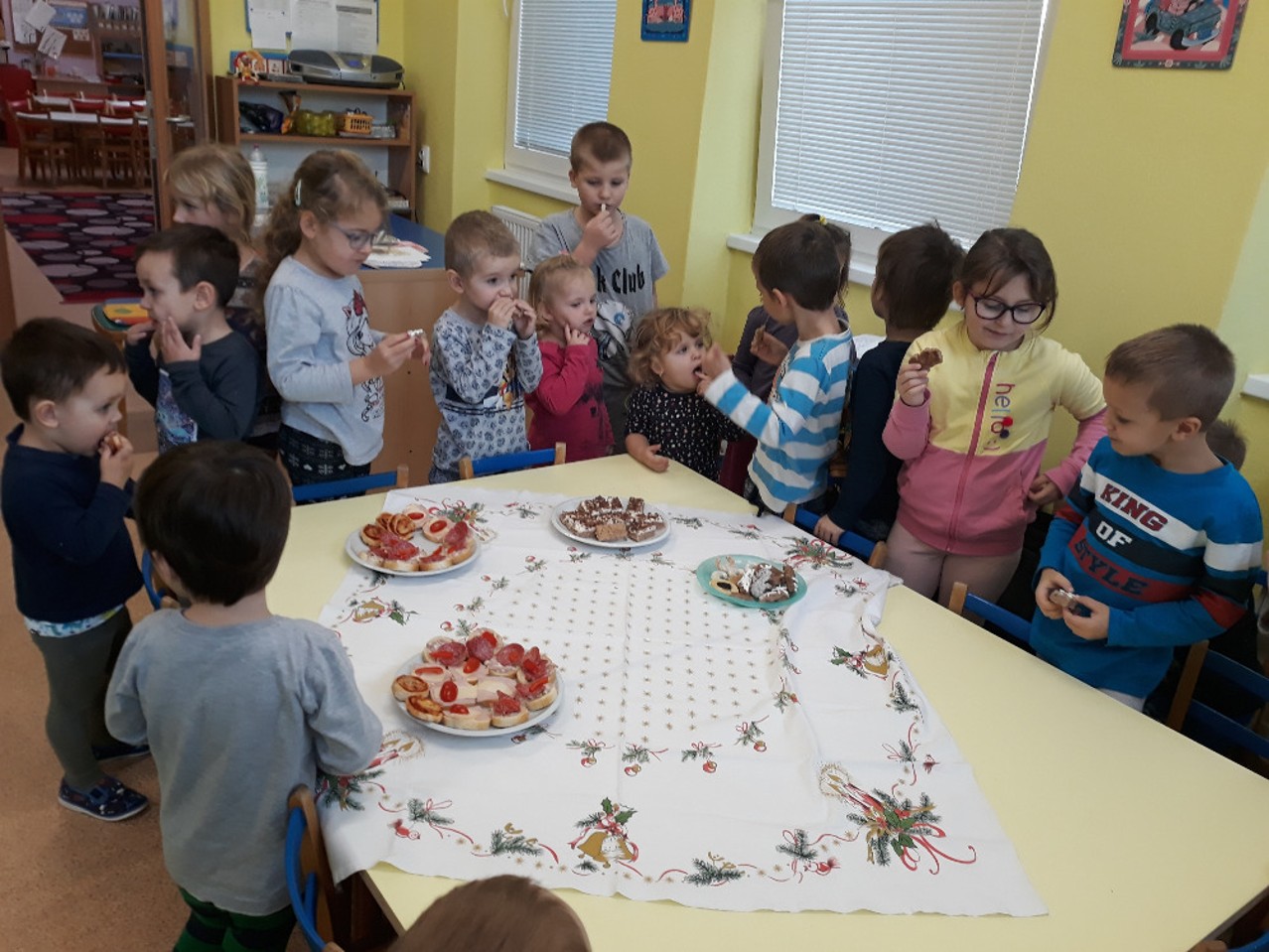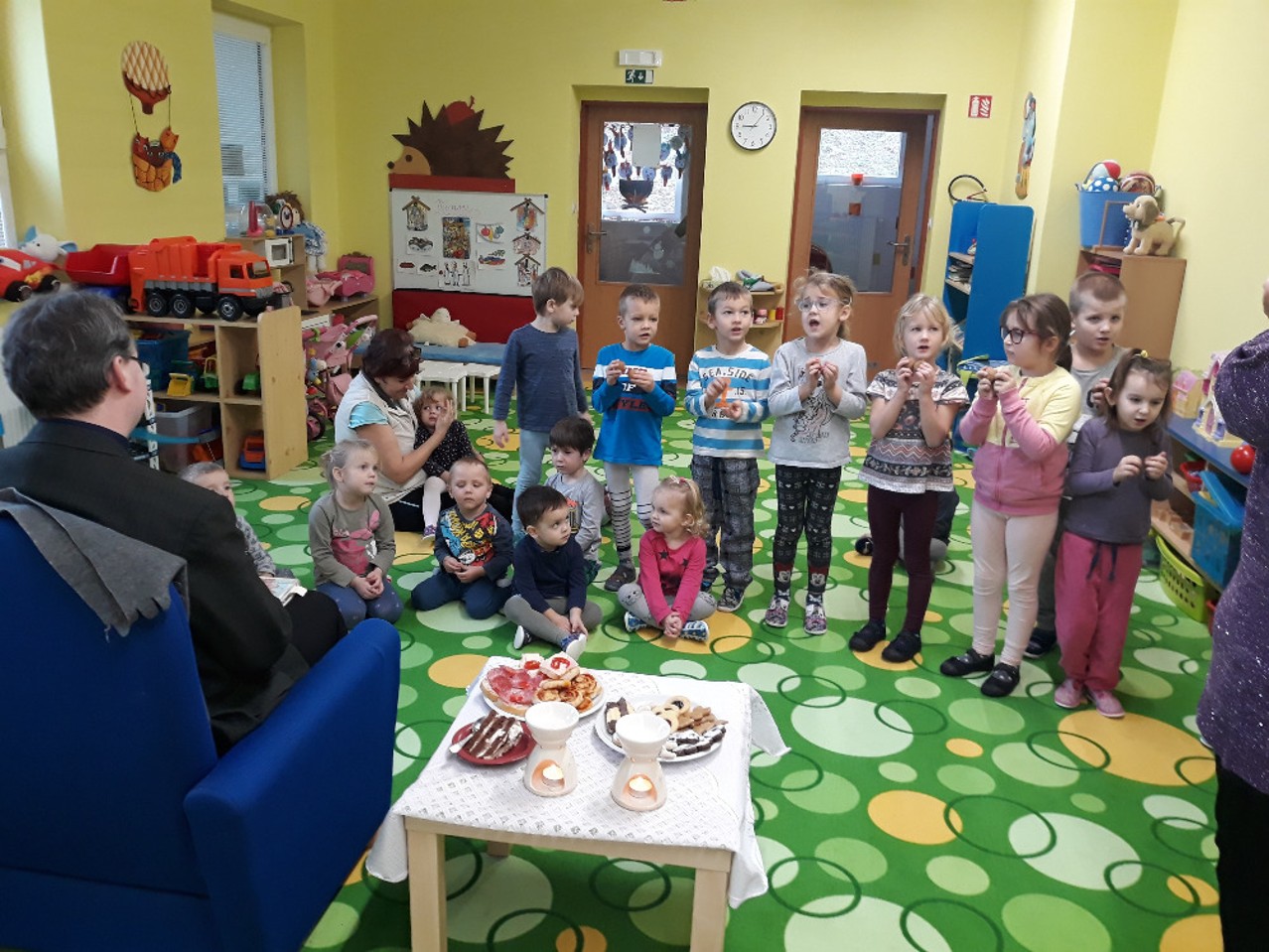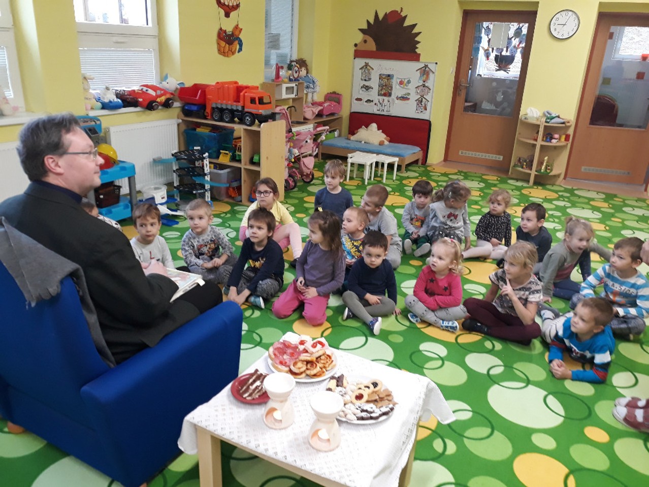 P. Mgr. Zdeněk Gerhard Klimeš navštívil tento týden naše nejmenší v MŠ. Při neformálním povídání dětem odpovídal na jejich všetečné otázky, přiblížil jim postavy Mikuláše, andělů (dobra) a čertů(zla). Společně s dětmi si prohlédli krásný betlém a zamysleli se nad pravou podstatou vánočních svátků. Na závěr děti otci Klimešovi předvedly něco z vánočního vystoupení, navzájem si předali drobné dárečky a společně si zazpívali koledy. Na závěr si všichni pochutnali na vánočních dobrůtkách, které pro tuto příležitost připravily některé šikovné maminky, paní učitelky a naše chůva. Všem děkujeme!