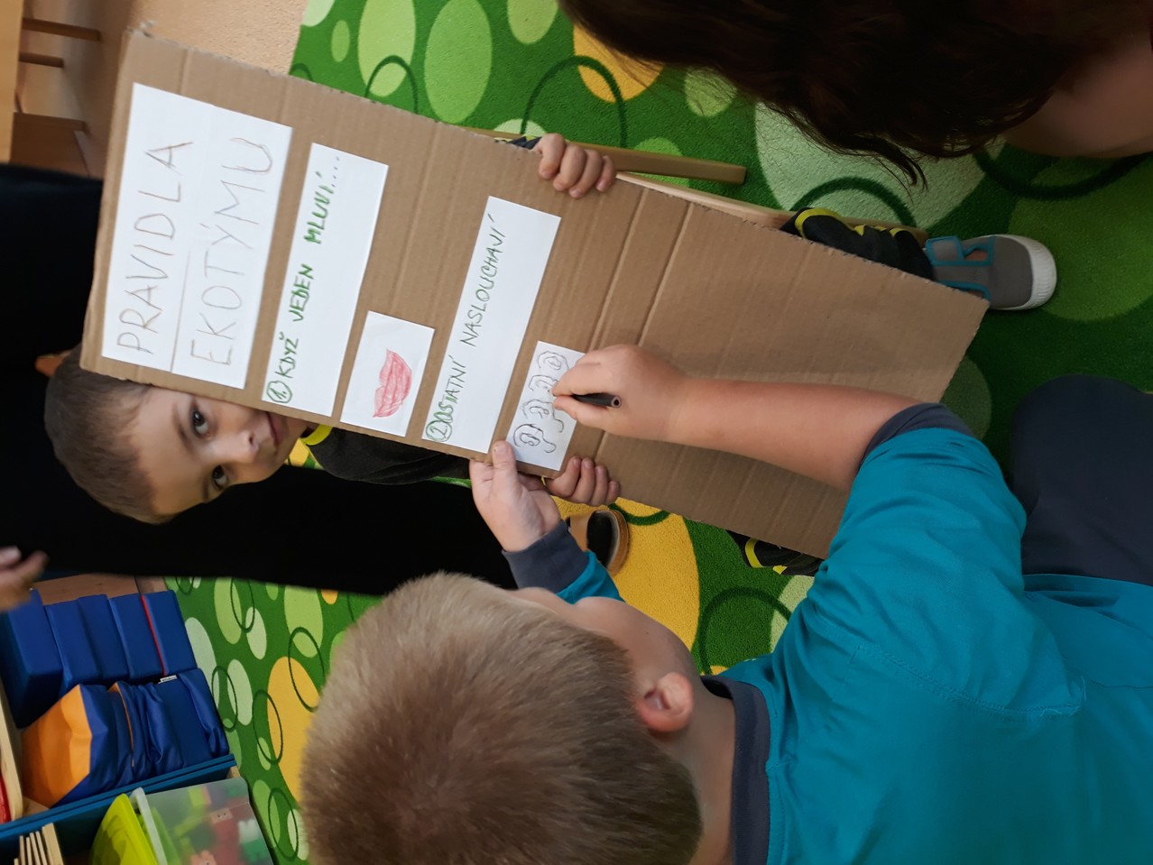 se konala ve třídě. Děti měly připraveny ovocný raut z jablíček a jiných podzimních pochutin. Poněvadž ekotým je v tomto školním roce tvořen z 90 % novými dětmi, museli jsme si stanovit i nová pravidla.