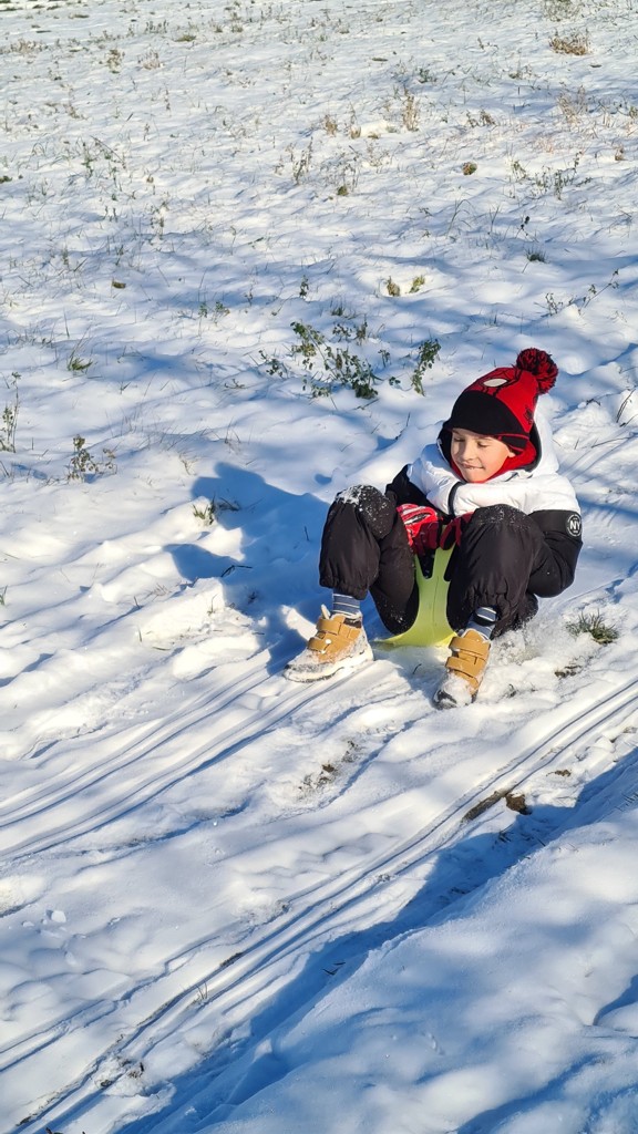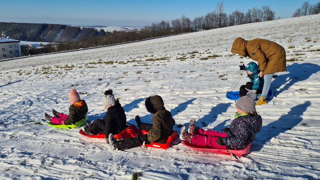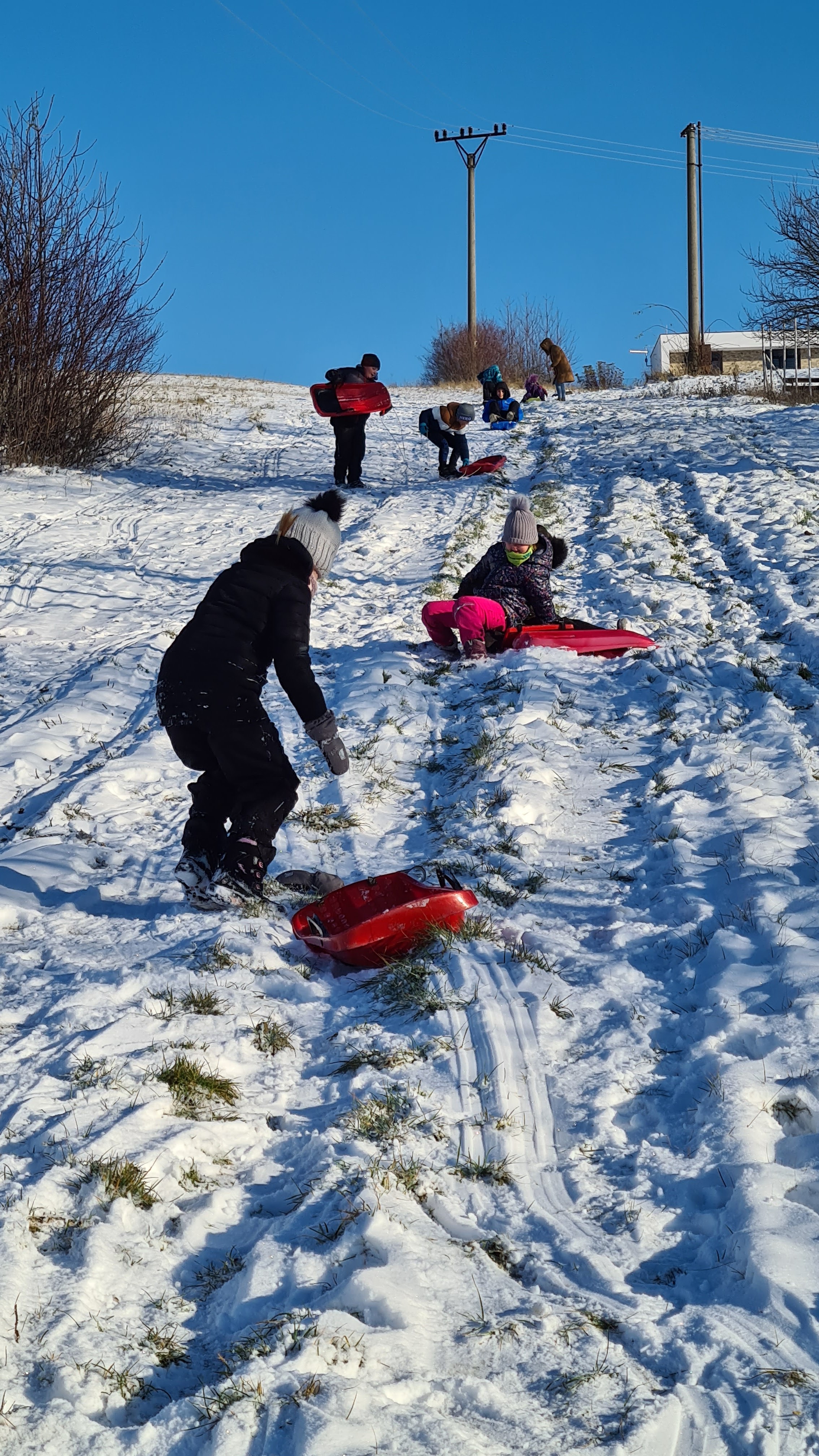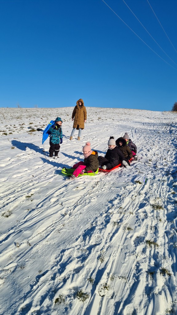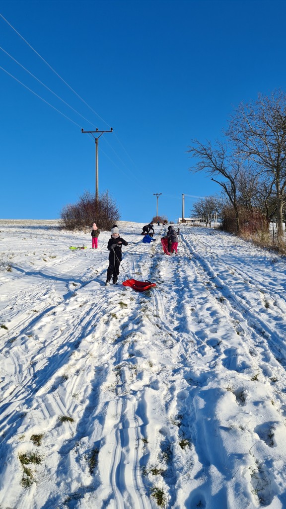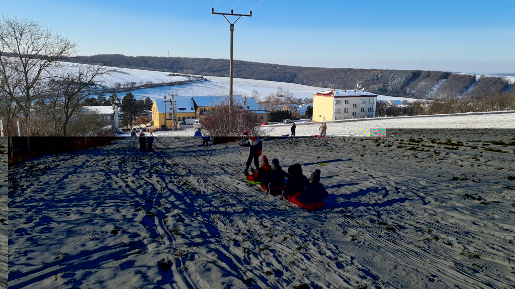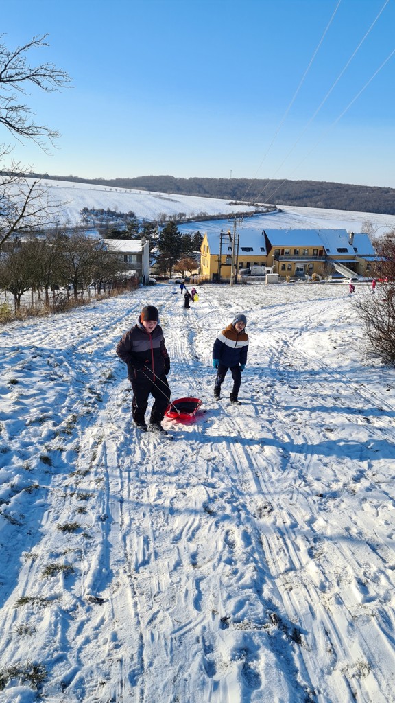 První sněhové vločky využily děti ze školní družiny k zimním radovánkám. Na sáňkách, bobech, lopatách a talířích se děti proháněly na kopci nad školou celé odpoledne.