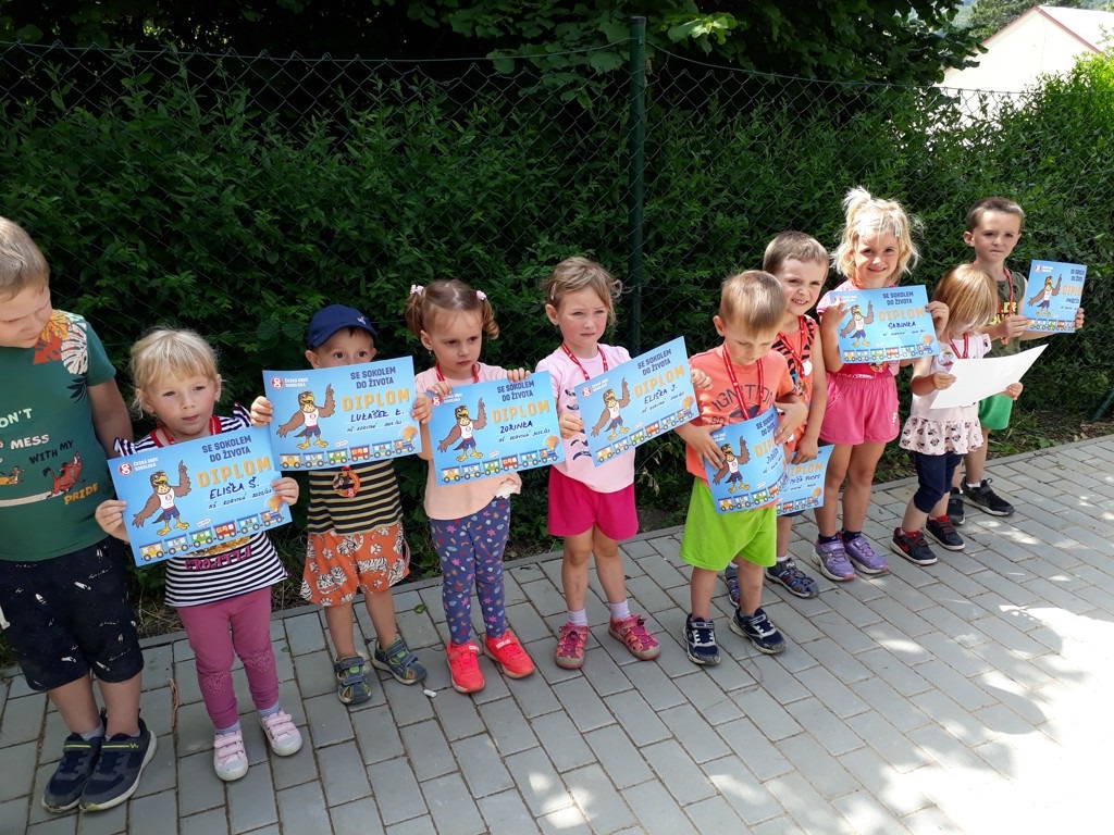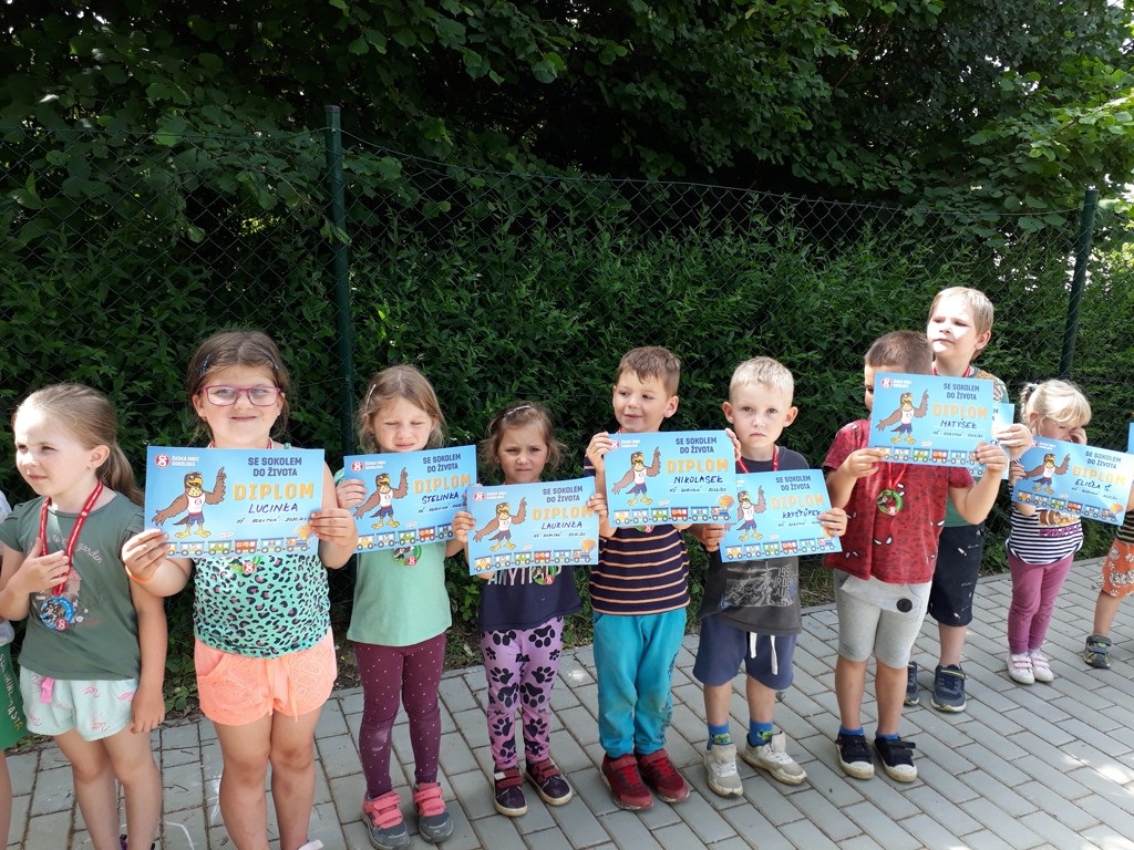 V pátek 23.6. jsme ukončili již 7. ročník projektu Se sokolem do života. Cílem projektu je, aby se děti co nejvíce zapojily do pohybových a rozumových aktivit, začlenily pohyb do svého života a naučily se ho mít rády. Jako odměnu za celoroční snahu a píli obdržely všechny děti medaili, diplom a další drobné dárečky.
