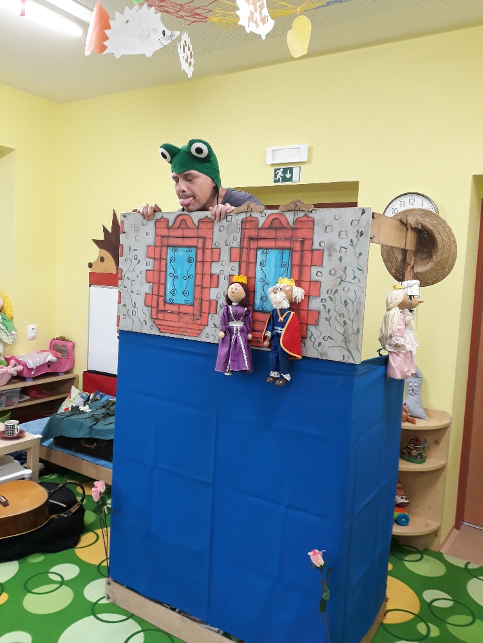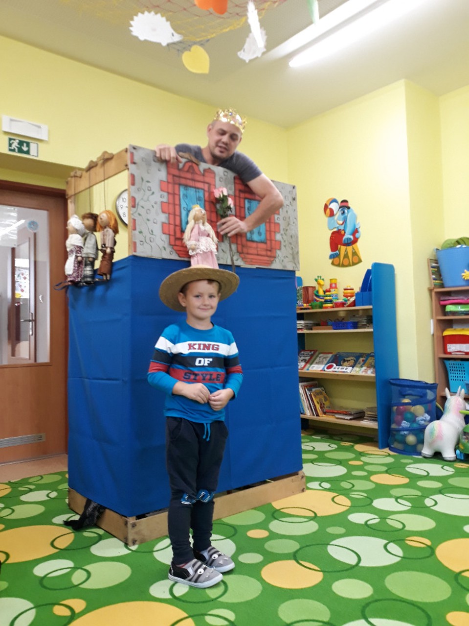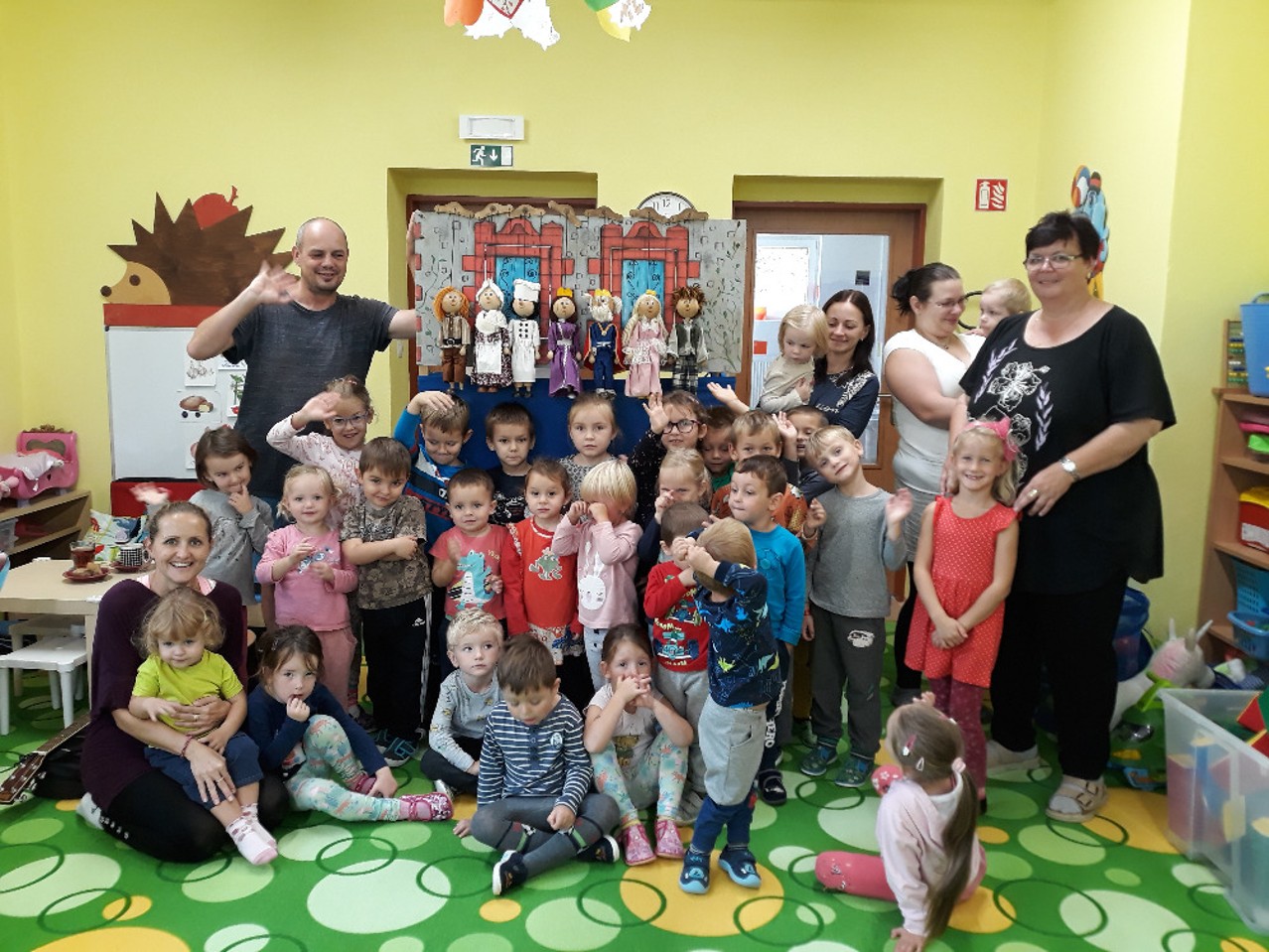Ve čtvrtek 3. října mezi nás opět zavítal pan Taraba se svou kytarou a loutkami. Z jeho pohádky „O Šípkové Růžence“ byly děti nadšené! I ti nejmenší sledovali s napětím děj a živě reagovaly. Díky citlivému vnímání dětských projevů pan Taraba střídal průběh pohádkového děje s tanečky při kytaře, při kterých se děti mohly na chvilku uvolnit a rozhýbat. Jsme rádi, že mezi nás přišly i maminky se svými dětmi z adaptačního klubu Mrňata.