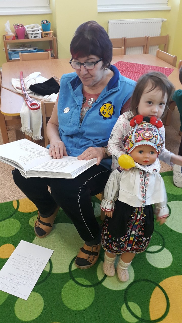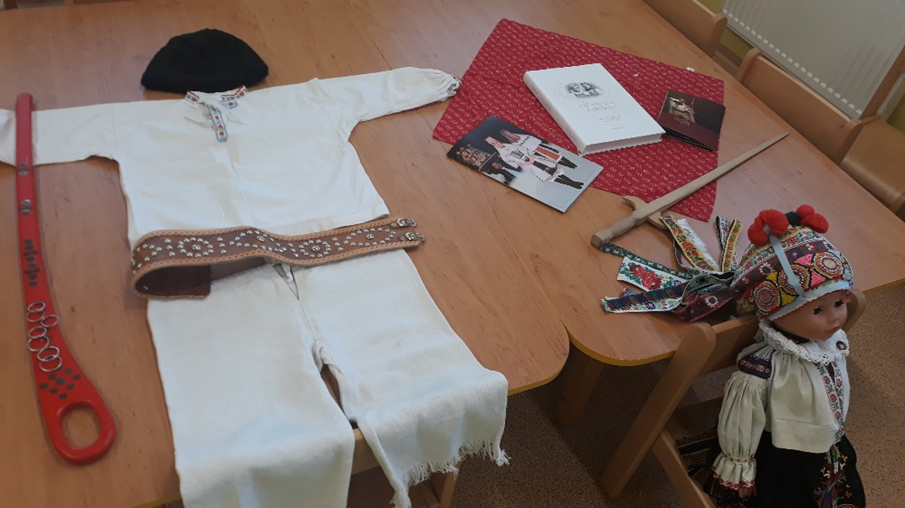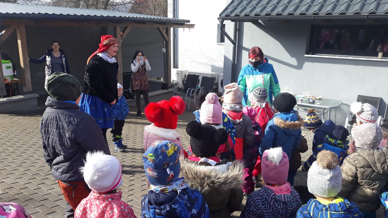 Druhou polovinu týdne jsem zahájili besedou, jejíž hlavním cílem bylo ukázat a přiblížit atmosféru fašanků dříve a nyní (ukázka krojů, četba z knihy, vyprávění příběhů, zpěv písní). To vše děti velmi zaujalo. Poté následovala ochutnávka „magašů“, které nám na opravdových kamnech venku připravili rodiče našich dětí. Třešničkou na dortu byl zpěv fašankových písní doprovázené hrou na harmoniku.