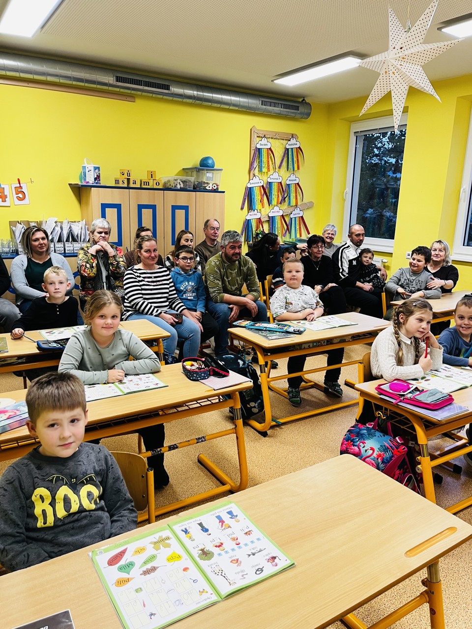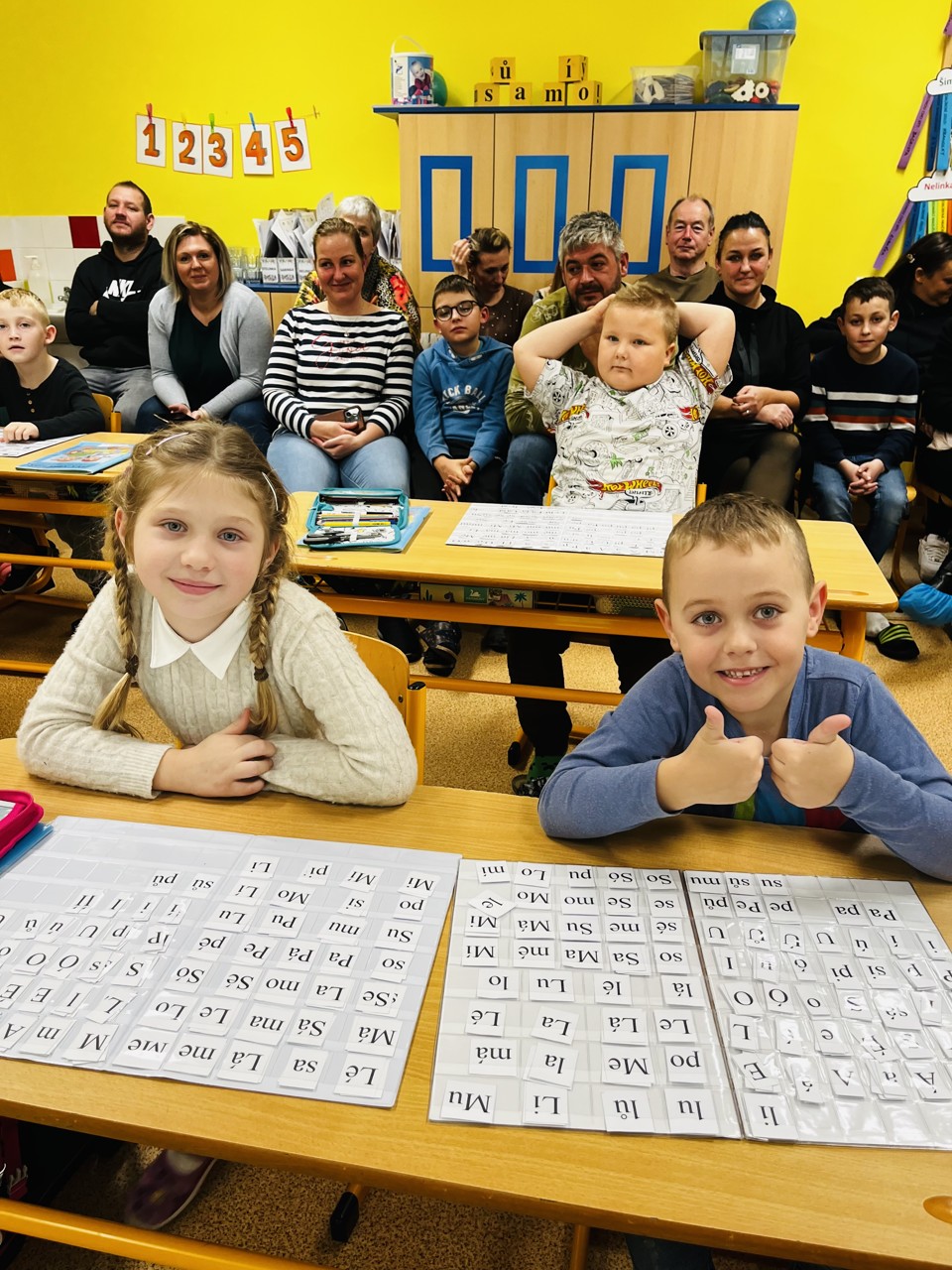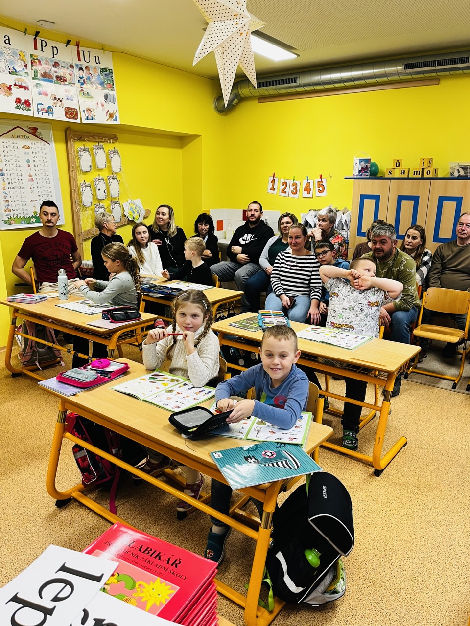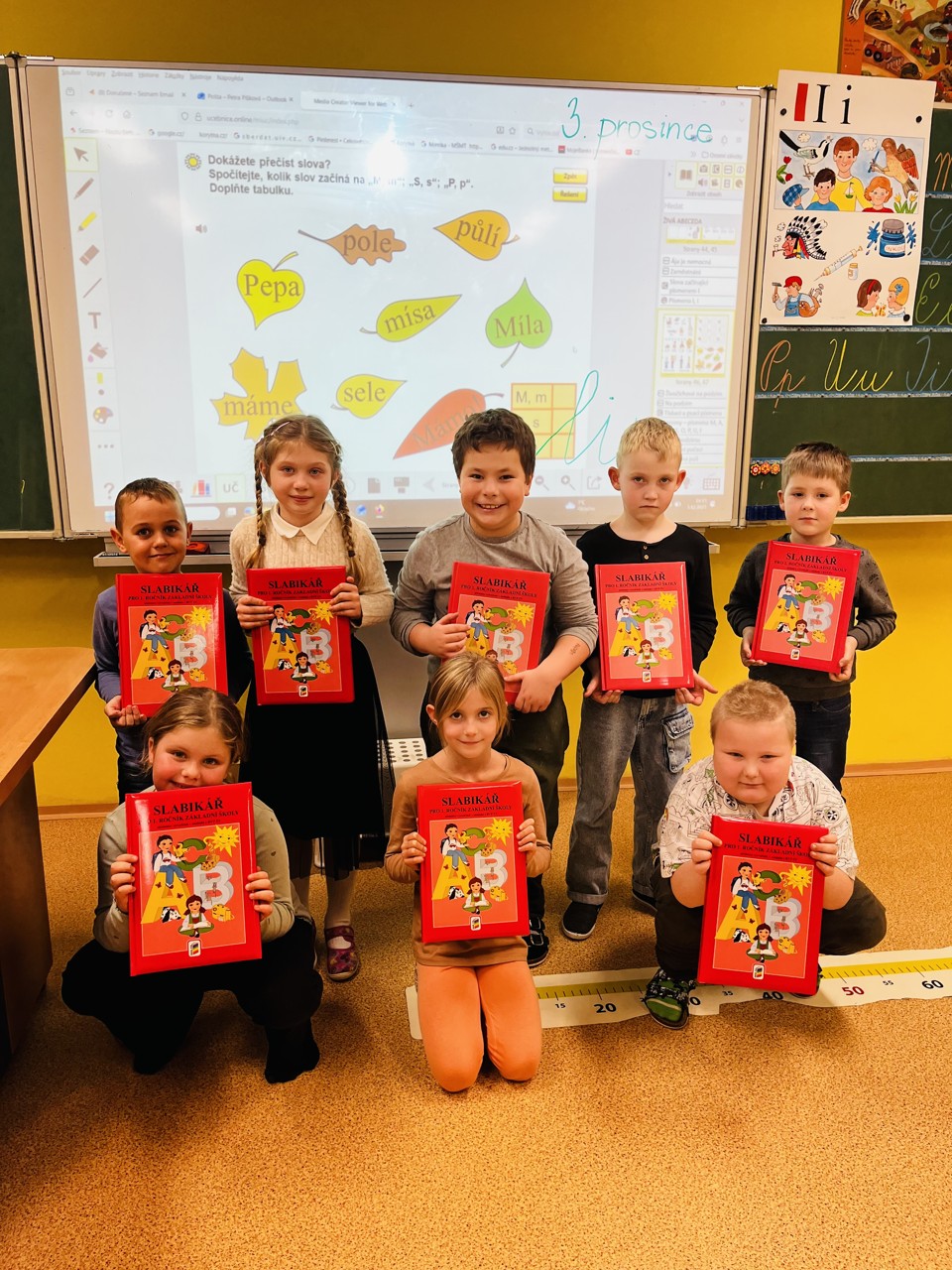 … v naší škole již tradiční akce pro žáky 1. ročníku. Děti zvládly všechna písmenka v Živé abecedě, a proto nastal okamžik ukázat své dovednosti rodičům, prarodičům a třeba i starším nebo mladším sourozencům. Při dnešní malé slavnosti předvedli malí školáci všechny dovednosti z hodin českého jazyka a právem mohli dostat krásné, novotou vonící Slabikáře. A proč je vlastně čtení tolik důležité? Odpovědí je hned několik: zlepšuje soustředění a pozornost, obohacuje vlastní slovní zásobu, je zásadním zdrojem poznatků a v neposlední řadě umožňuje vžít se do života knižní postavy, což je základem empatie. Proto vážení, čtěme, ať je náš život o trošku bohatší.