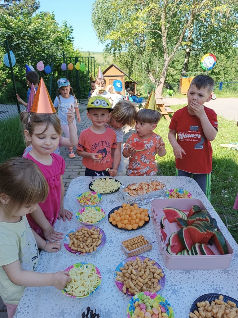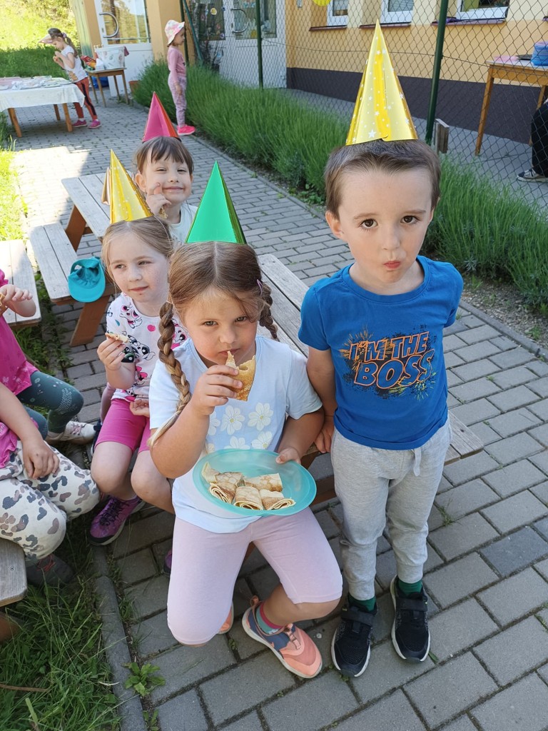 Svátek dětí jsme oslavili formou Zahradní párty. Slavnostní atmosféru navodilo i krásné počasí. Pomyslnou třešničkou na dortu bylo Palačinkování. Předškoláci už ví, jakých surovin je potřeba na přípravu palačinek, takže mohou doma mamince pomáhat. Poděkování patří i rodičům, kteří se z velké části na oslavě podíleli. Děti si Svůj den pěkně užily.