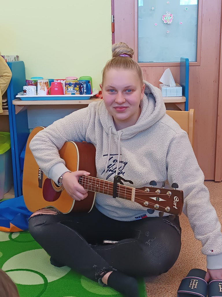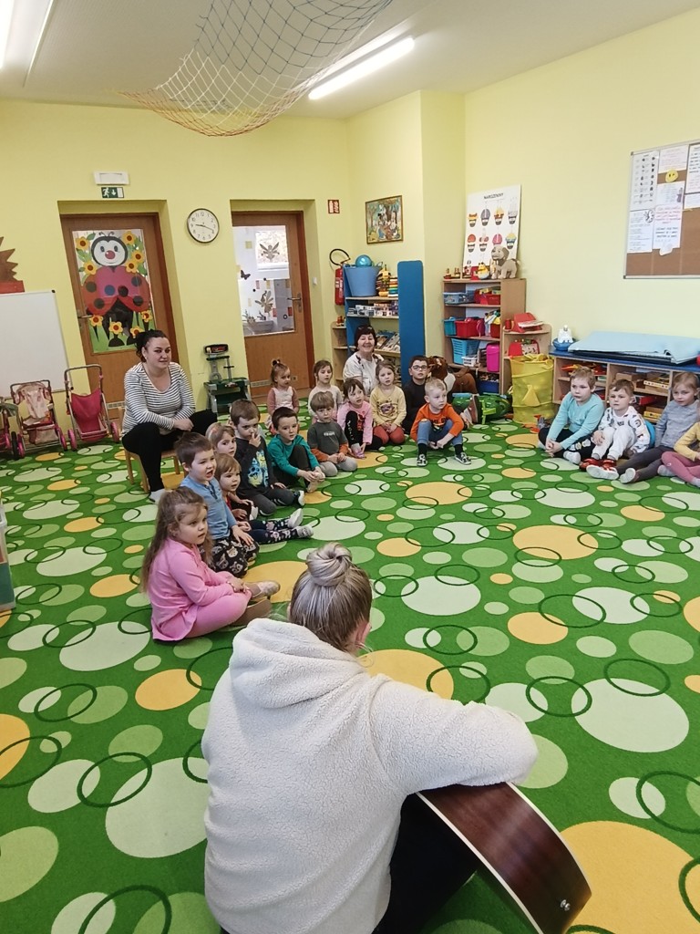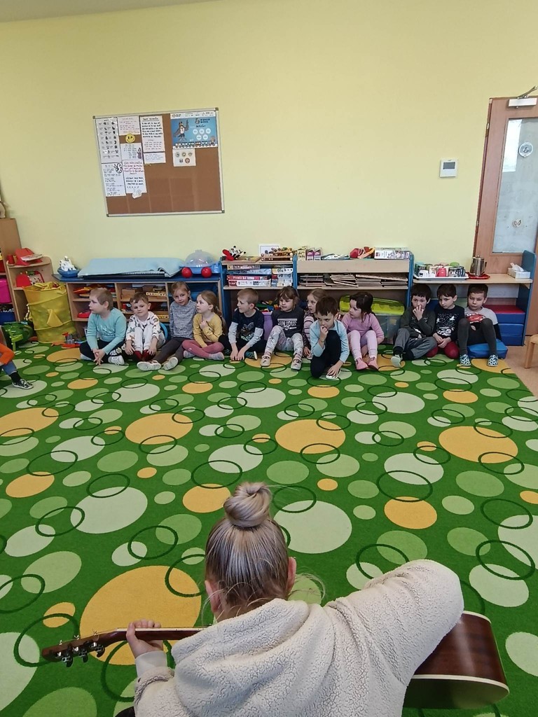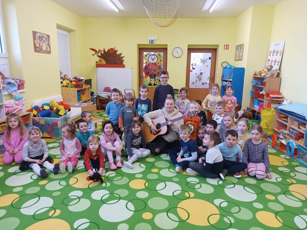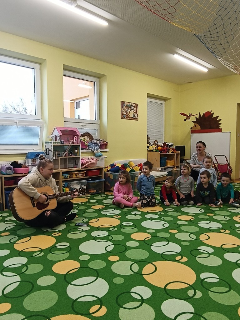 Dopoledne plné písniček zažívaly děti naší MŠ. Praktikantka Nikola Čagánková přinesla do řízené činnosti svůj oblíbený hudební nástroj - kytaru, se kterým se děti napřed seznámily teoreticky a pak už začala zábava - známé dětské písničky střídaly písně lidové i moderní, češtinu střídala slovenština i angličtina. Děti písně nejen zpívaly a poslouchaly, ale i hádaly.