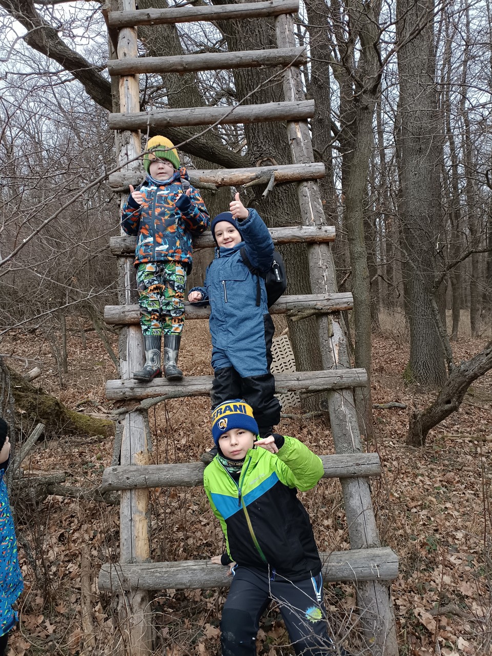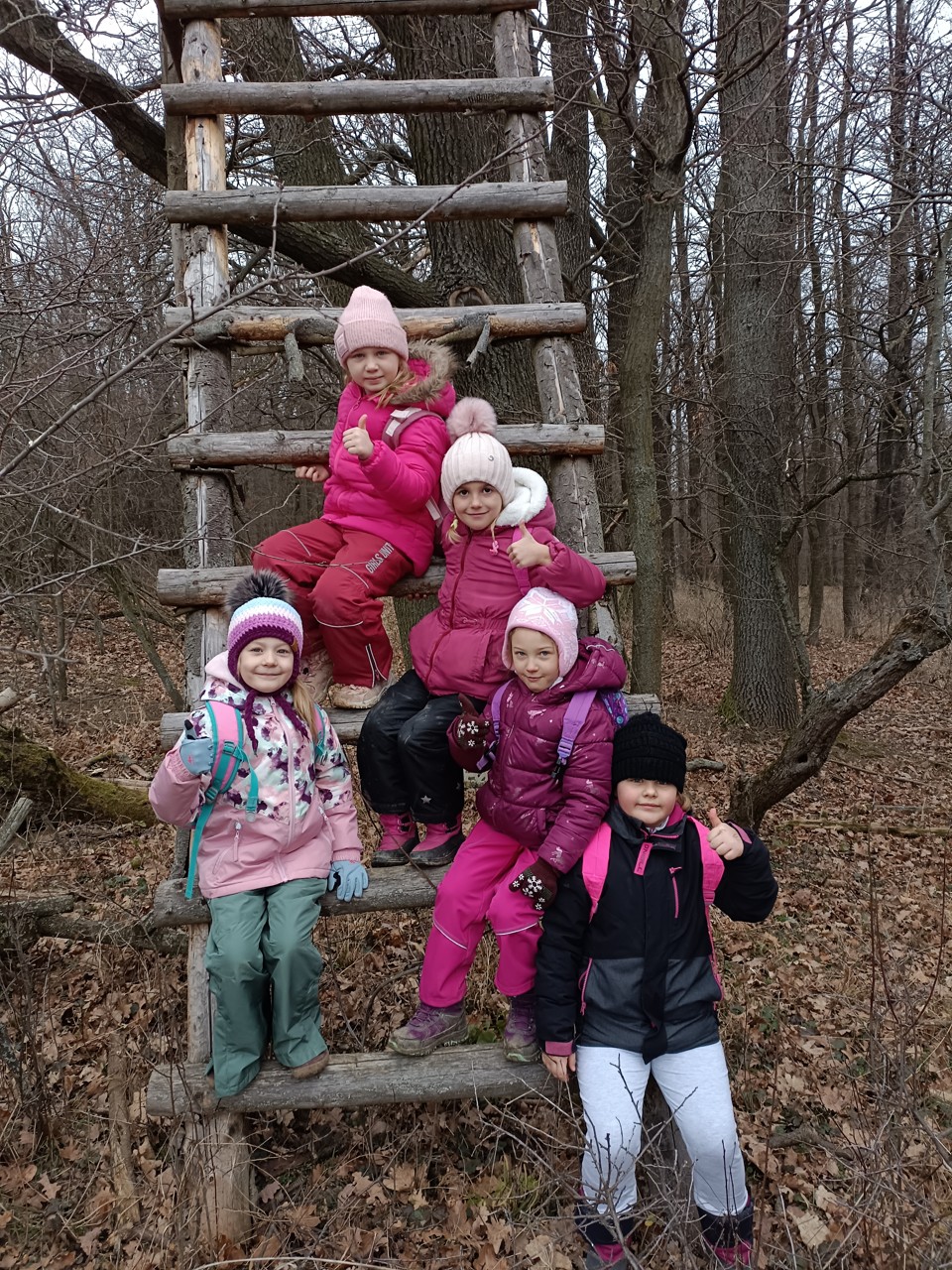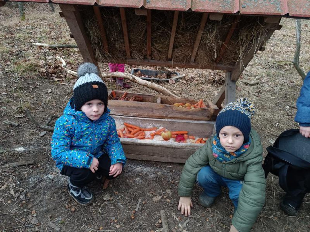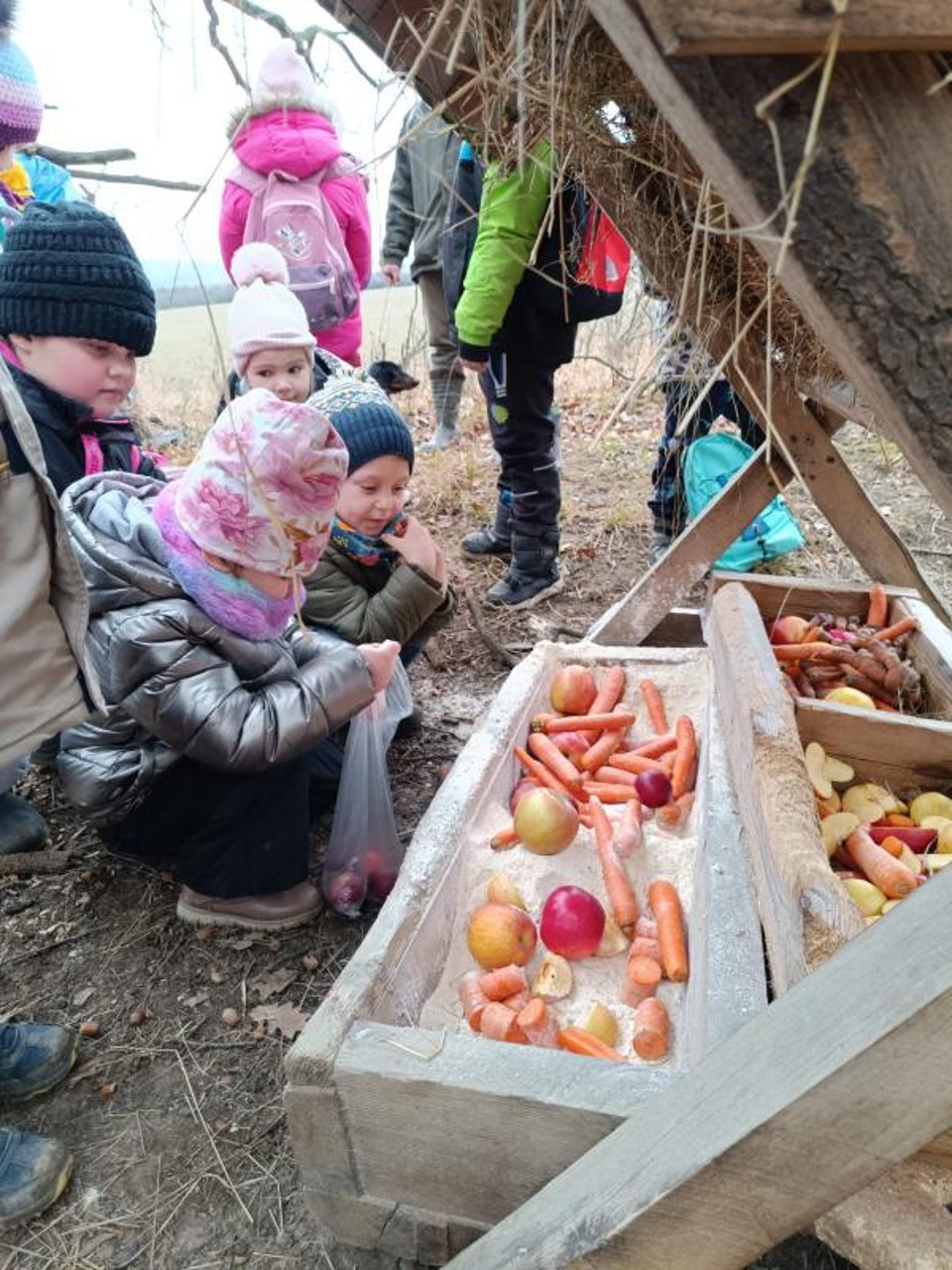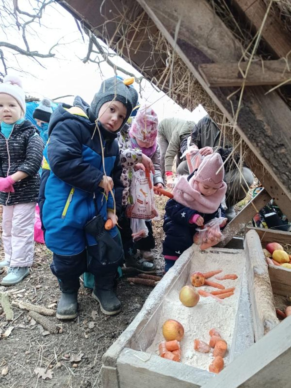 V pátek jsme se vydali obdarovat zvířátka ke krmelci. Děti přinesly jablíčka, mrkev a kaštany, které nasbíraly už na podzim. Cestou nám pan myslivec Peťa Mahdal vyprávěl čím se živí a jaká zde můžeme zahlédnout. Pokoušeli jsme se najít i jejich stopy. Do krmelce jsme nasypali dobrůtky a pak jsme potichu odešli, aby se zvířátka nebála jít pro svou potravu. O naši bezpečnost se staral i jezevčík Lexa, který zaslouží také pochvalu.