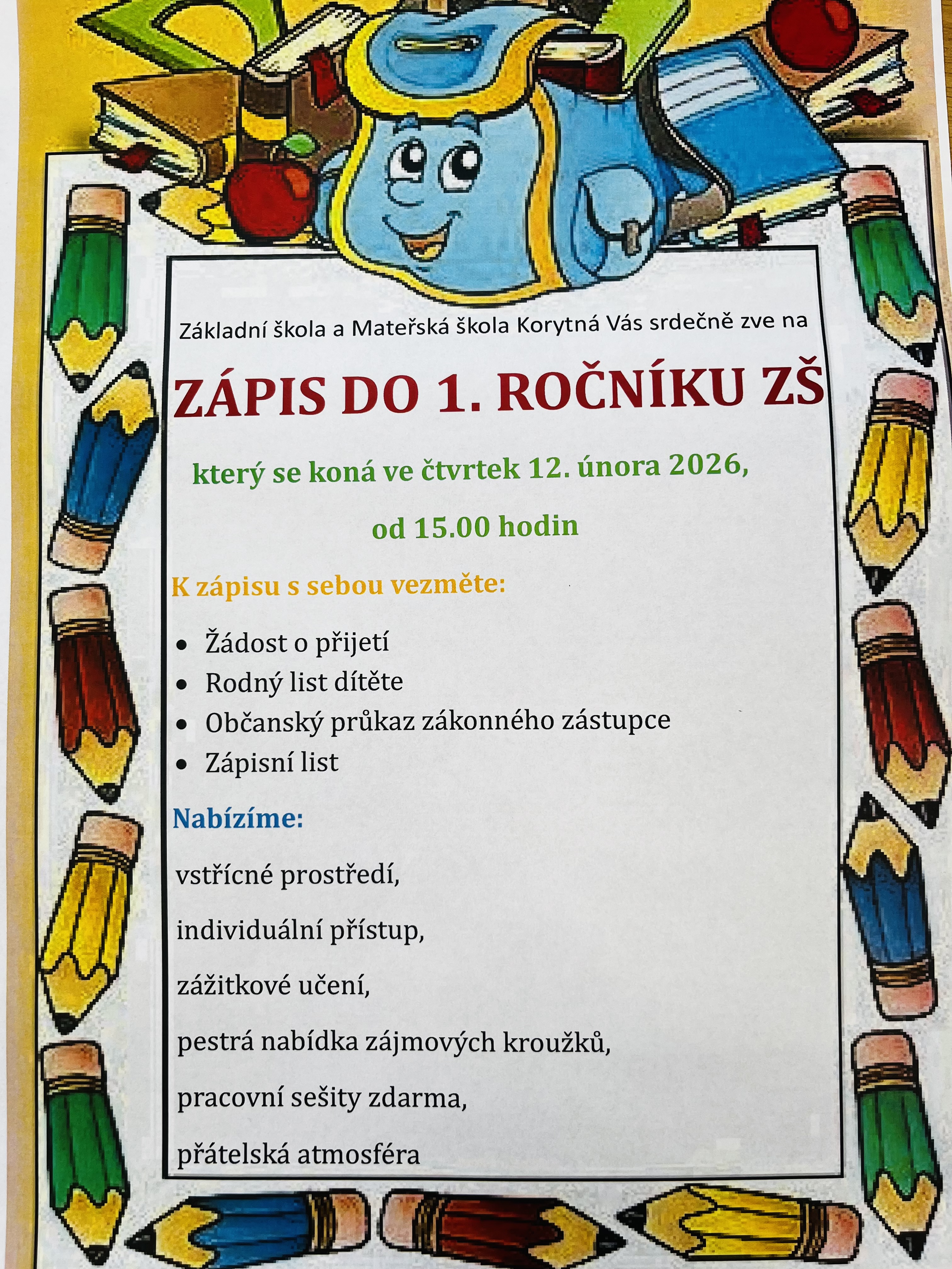 Úvodní stránka » Základní škola » Aktuality ZŠ » Zápis do 1. ročníku ZŠ a MŠ Korytná